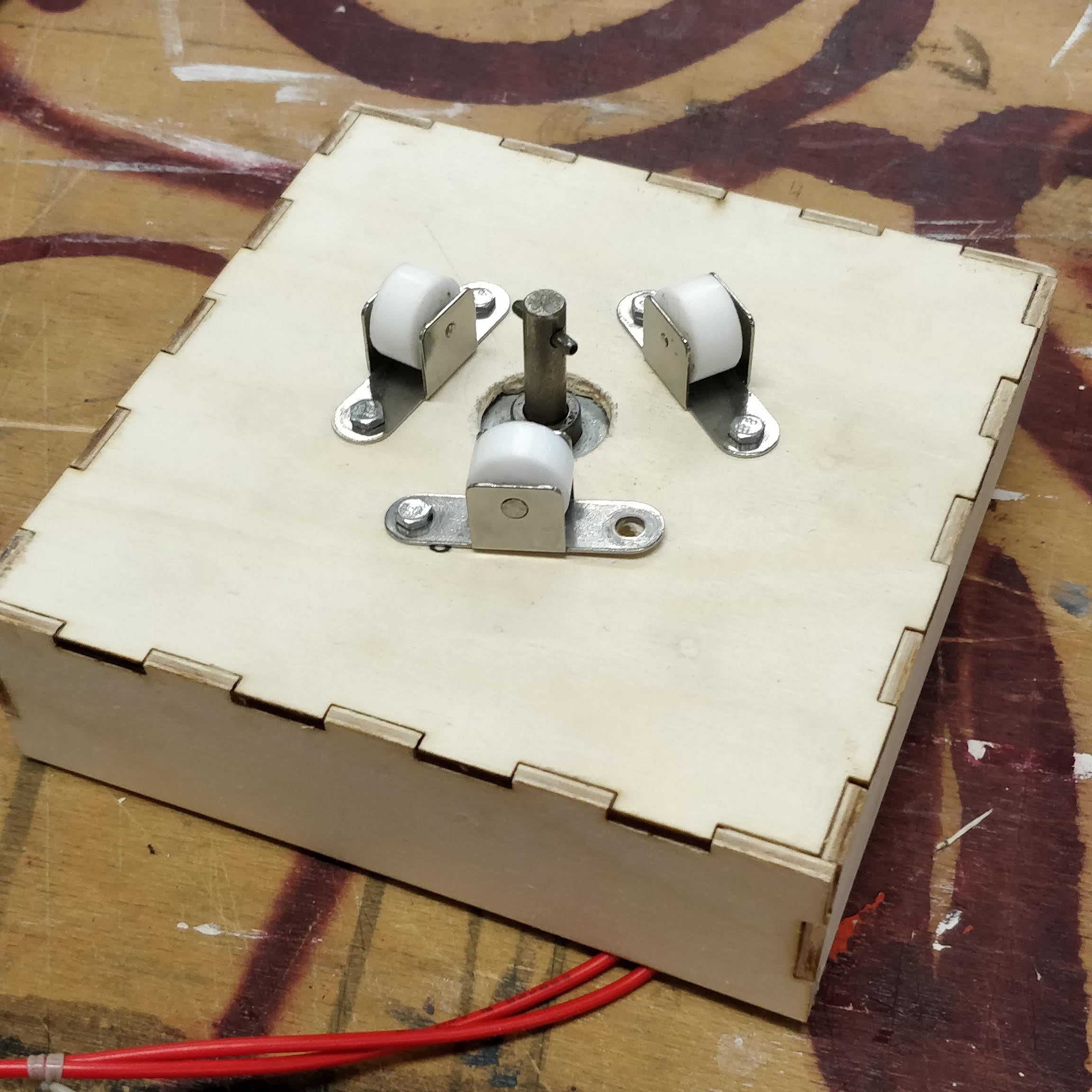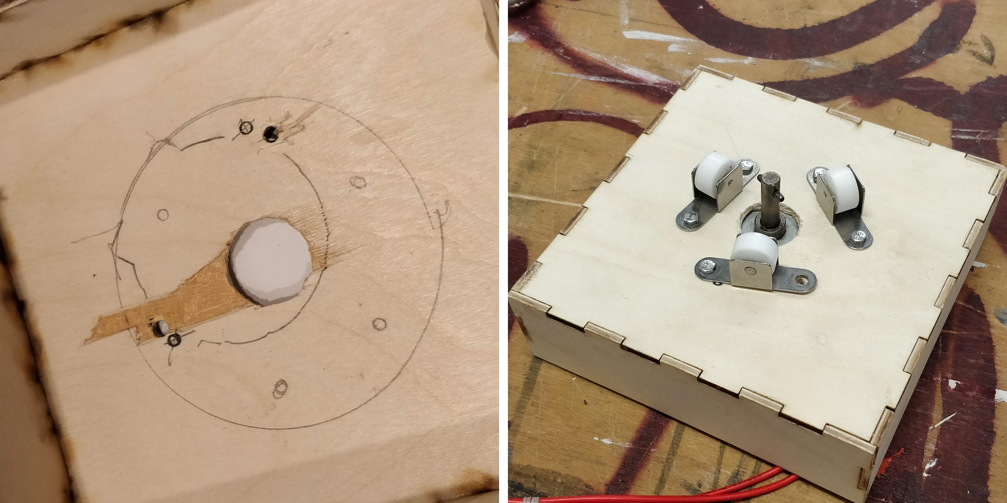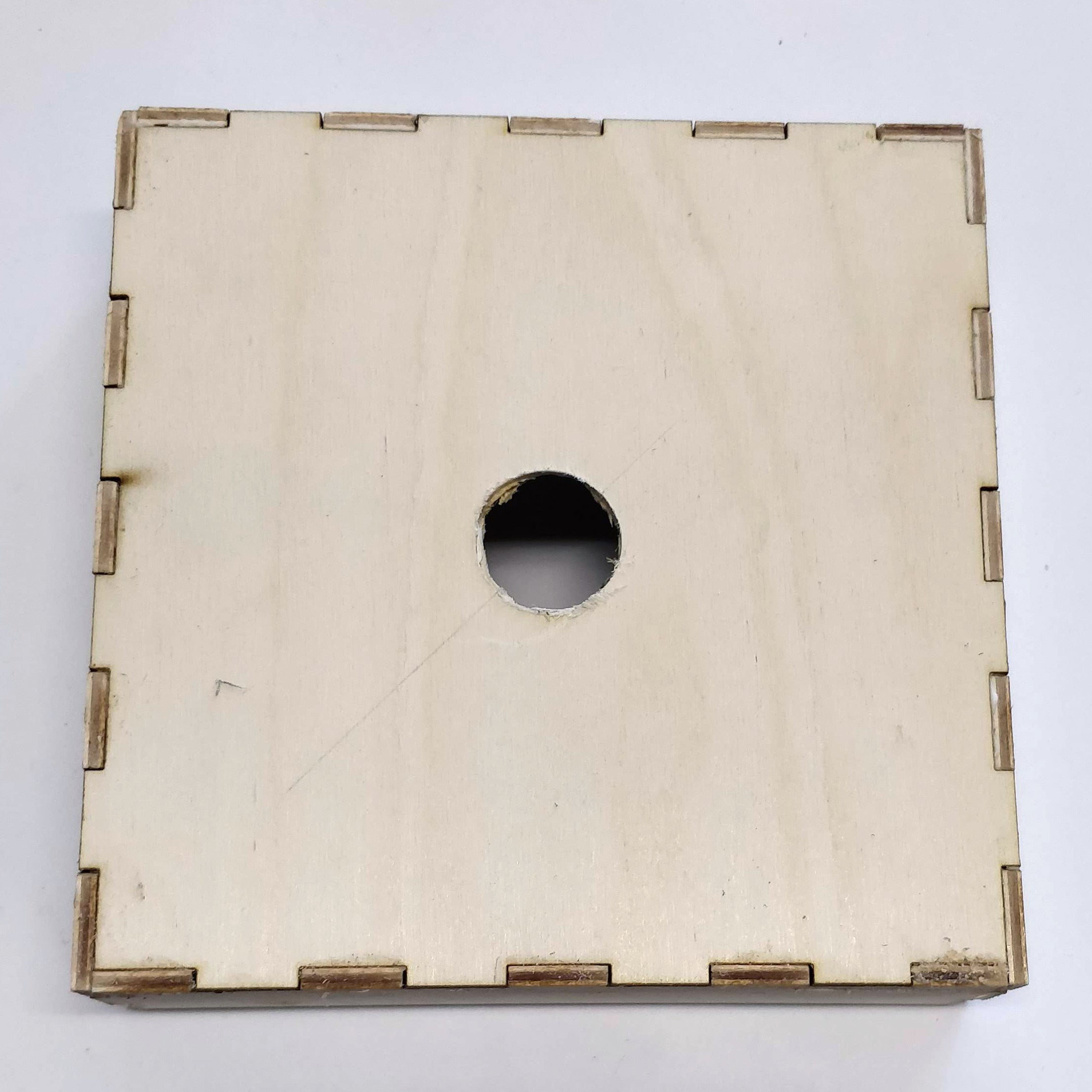 I used a laser cutter for this. But like I already said, anything could be used for this. As long as it is strong and you can attach it to the ceiling. Because I am stupid from time to time and I forgot to edit my box before I laser cut it. You can see the marks of me drilling a hole in the center of the box manually. But I have modified the file - see bottom section - so you do not have to manually drill a hole in the center and a gap on the side for the wires. I am not going to talk you through how to assemble these pieces of wood to form a box