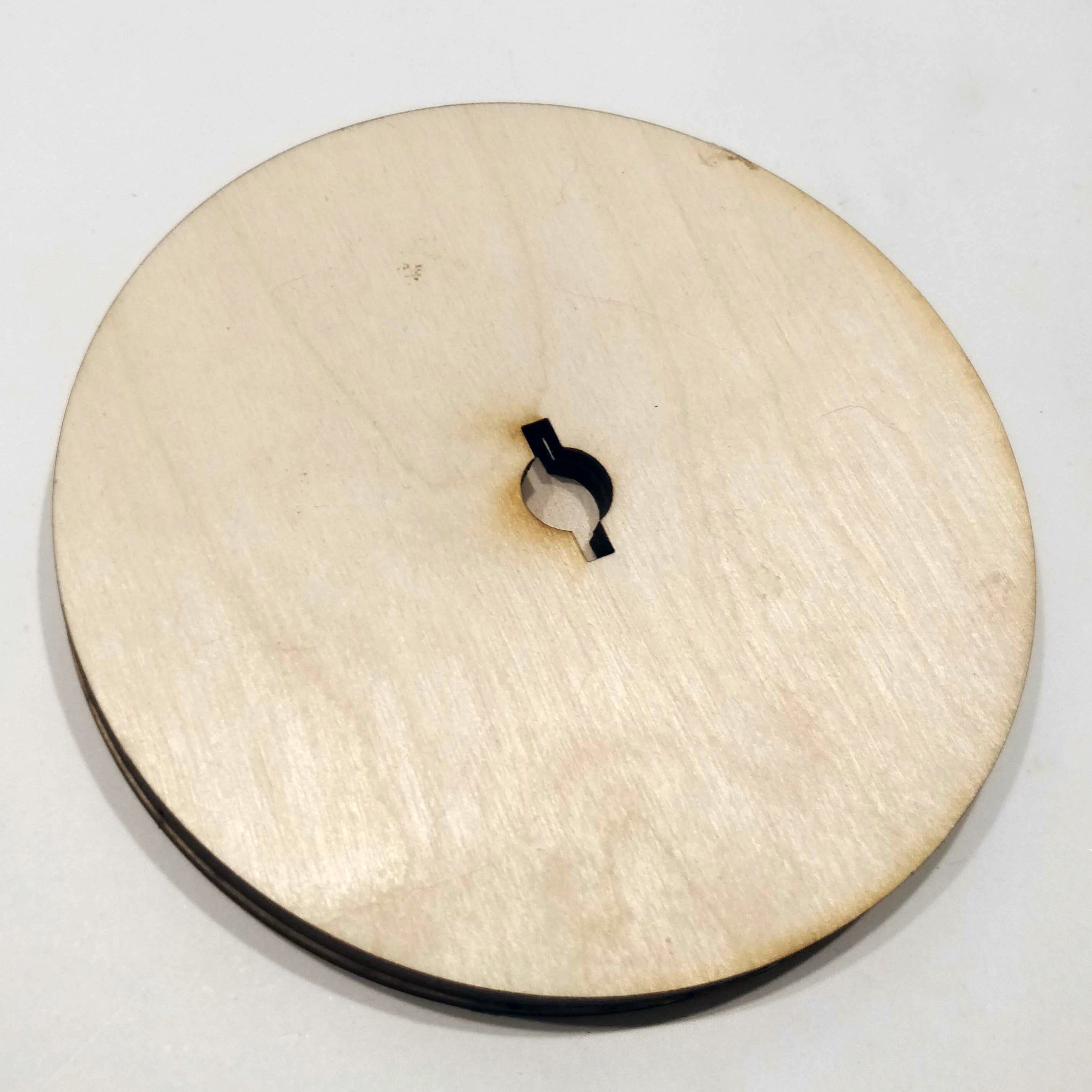 Either way, with a laser cutter you can make a nice plateau which can support whatever you'll put on. I used three layers of 3mm plywood for this. Two of which have a shape cut out in the center, which - sort of - matches with the shape of that on the motor. The third one is just a circle without this hole. All three layers are glued upon each other with wood glue and it works super well. The plateau rests on the bearings. Which makes it nicely balanced.
