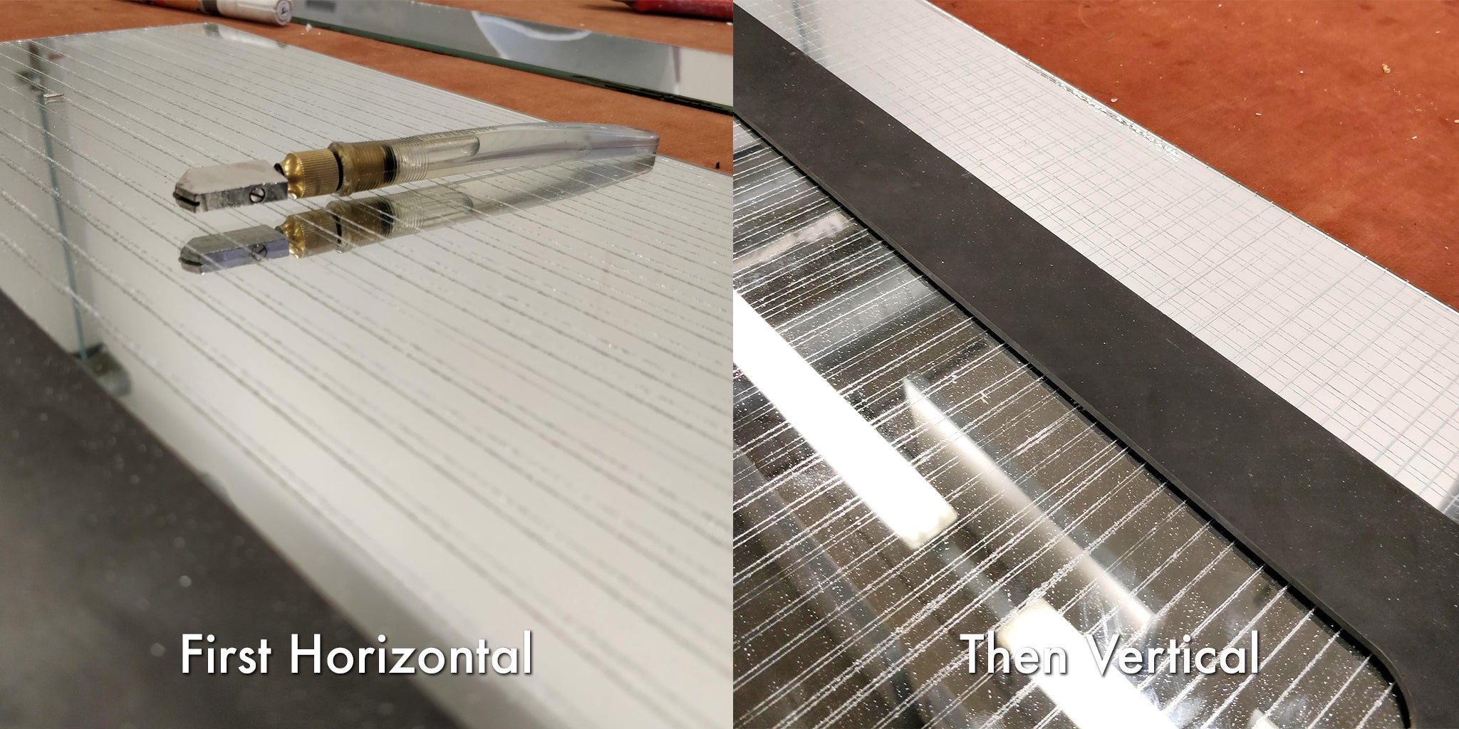 After marking the glass, use the glass cutter to cut straight lines with the help of a square.