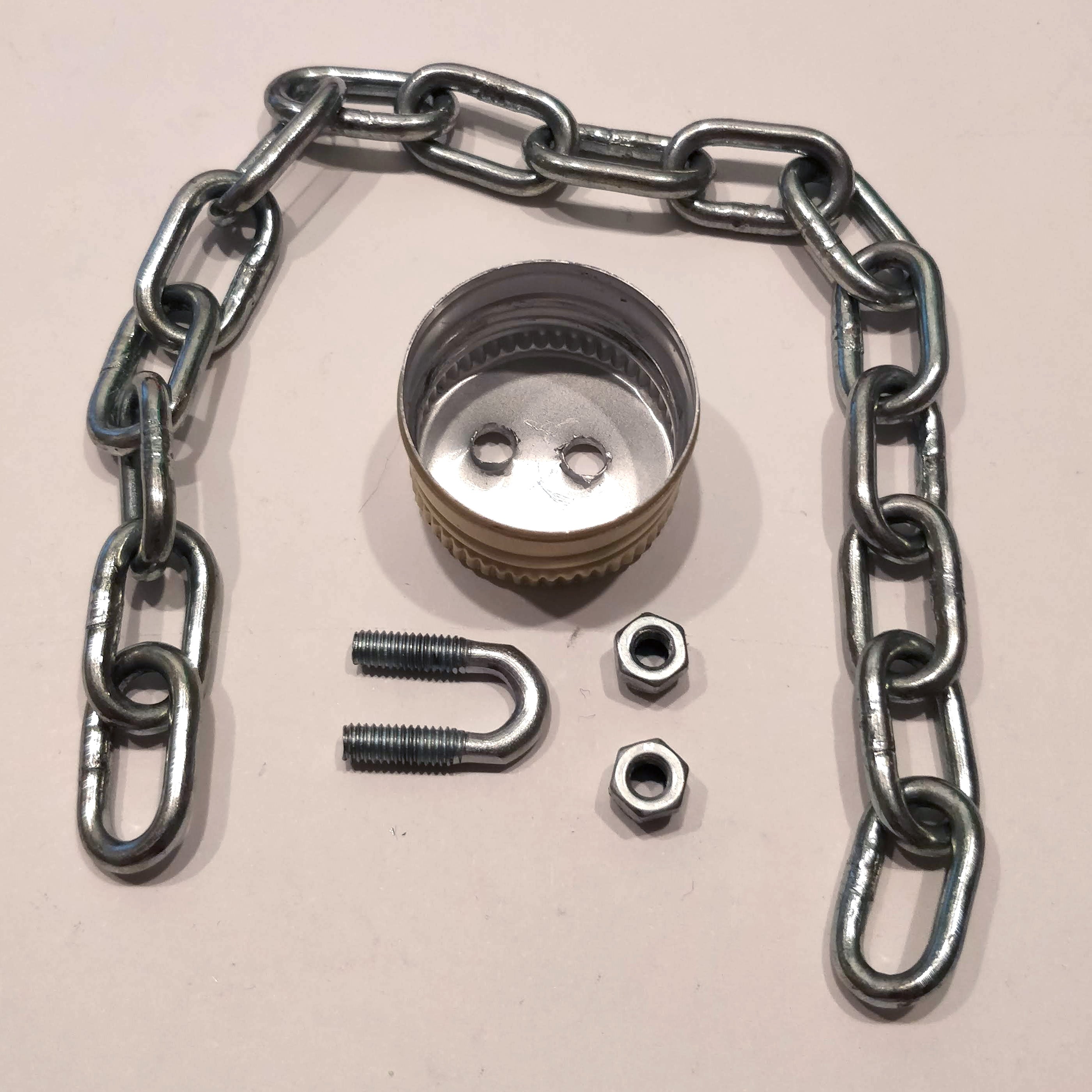Now our box is ready, we only need to attach the metal chain to the motor with the help of a piece of metal wire. To attach the chain with the bottle I used the materials as shown in the image below. I have no idea how this curved metal thing with threads is called. But the picture is pretty much self-explanatory. Just please do not use hot glue to attach the metal wire with the disco ball. It won't hold the weight and you do not want anything made of glass, drop on the floor from 2 meters high. In case you use the imperial system. You do not want anything made of glass, drop on the floor from 2 meter high. Seriously, just don't use hot glue for this.