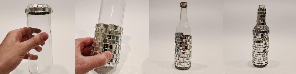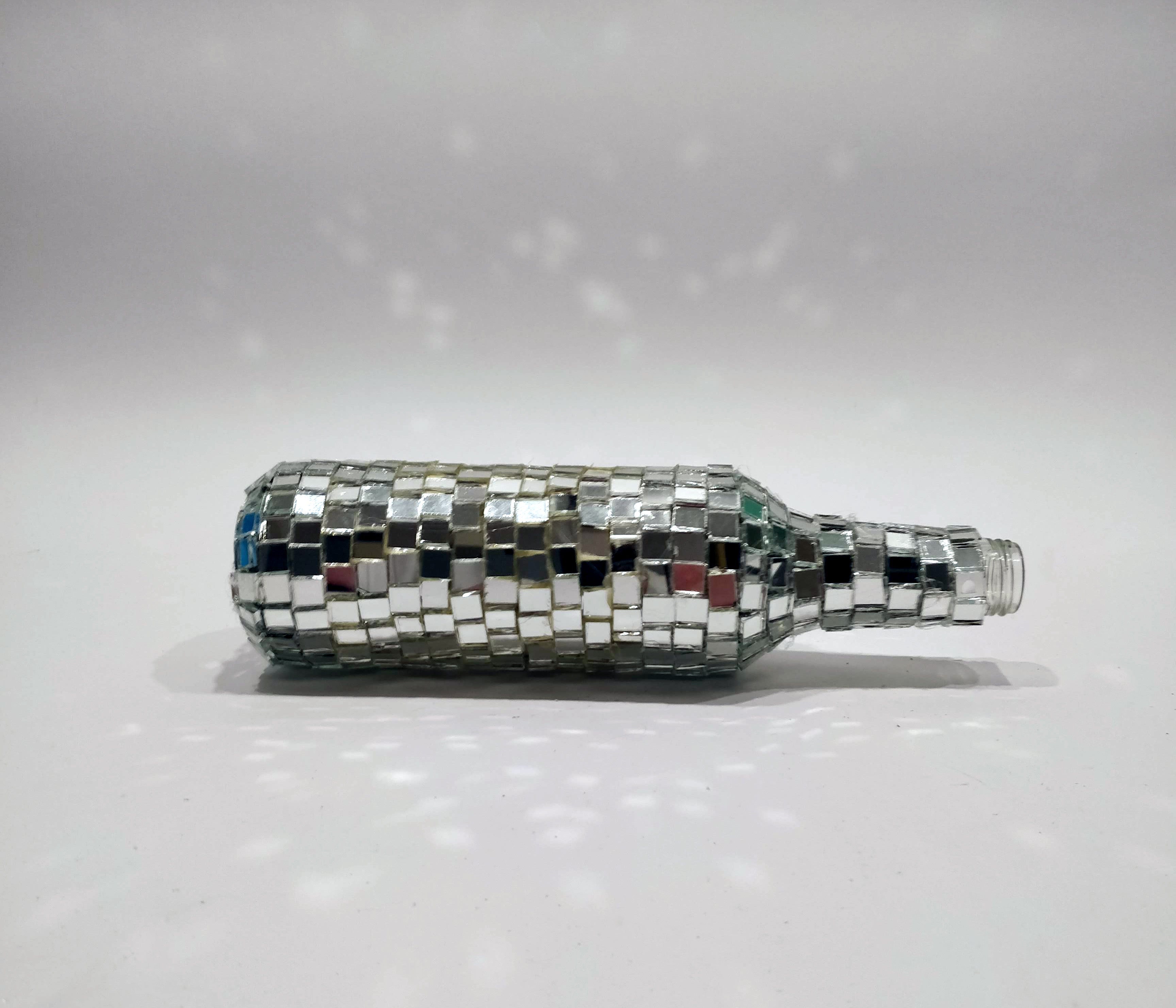 This fabulous wine-bottle-disco-ball is my personal end-result. It is done messy, with glue all over the place and mirrored pieces which do not align nicely. But with a bit of clean-up and when put in an environment where it really shines (a dark room). You won't notice this at all. Especially since all these details are only noticeable when you look at it from a distance less than 3 foot.