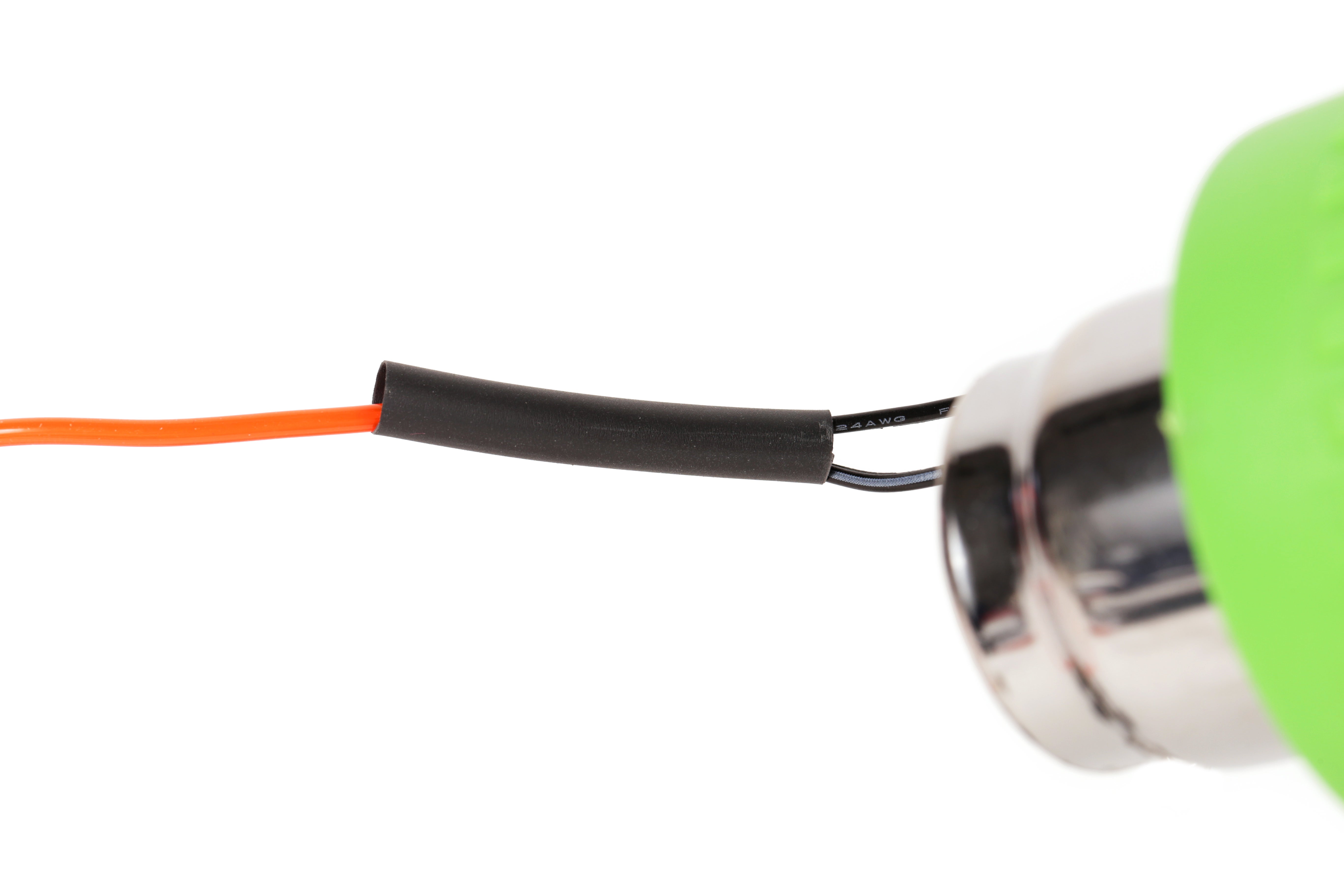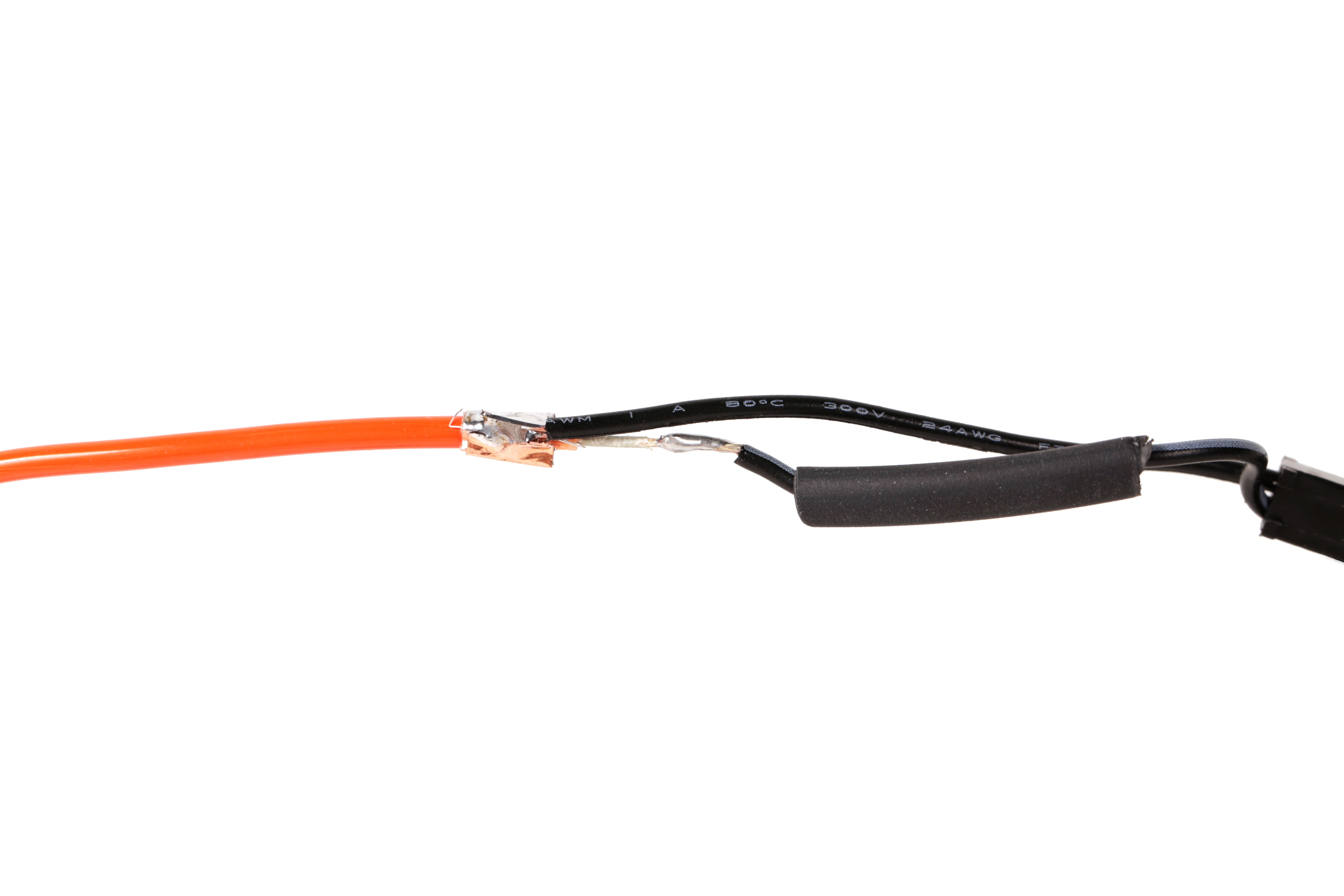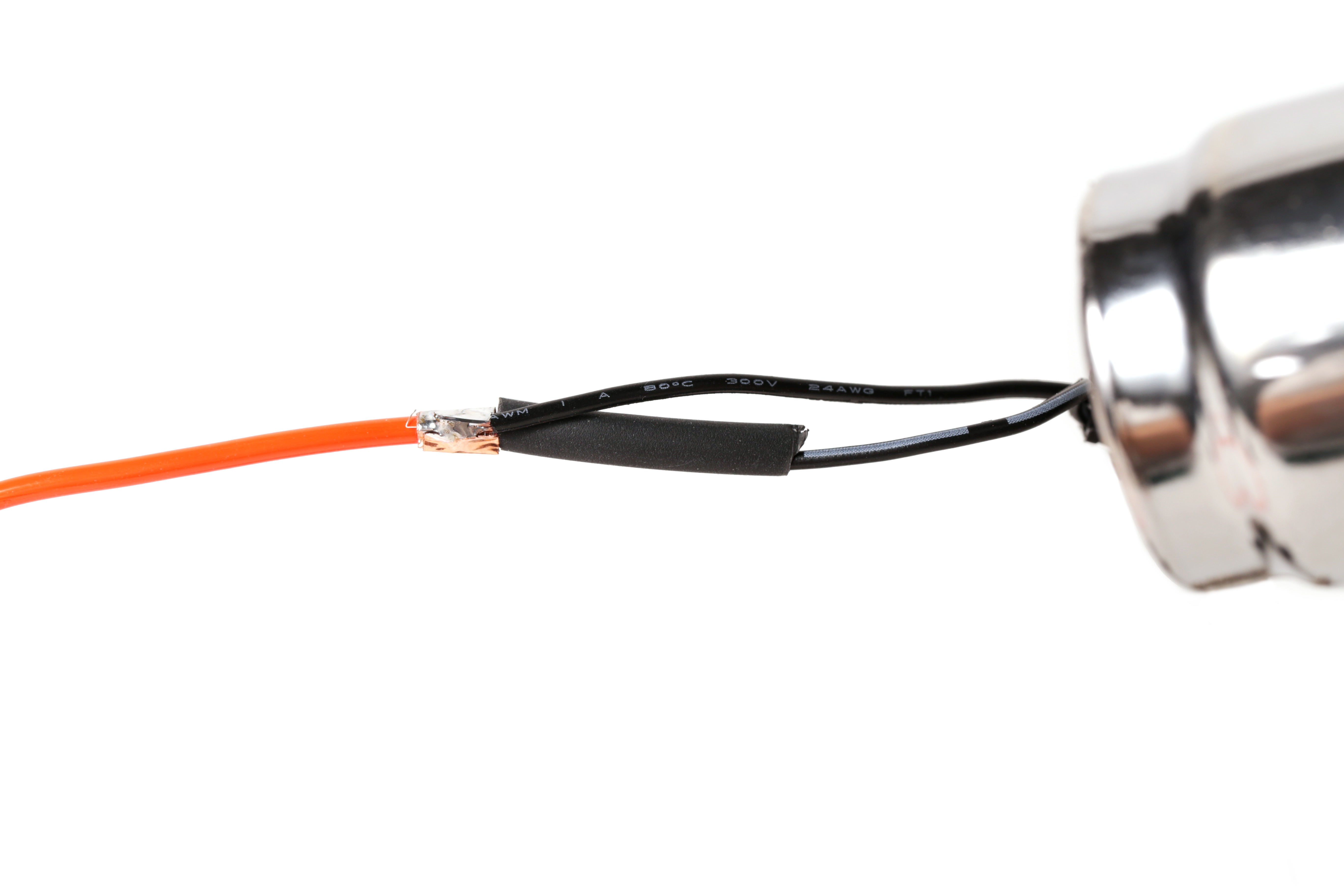 Slide the small piece of shrink tube over the center copper core and shrink it into place. Slide a larger piece of shrink tube over all of the connections and then shrink it into place.