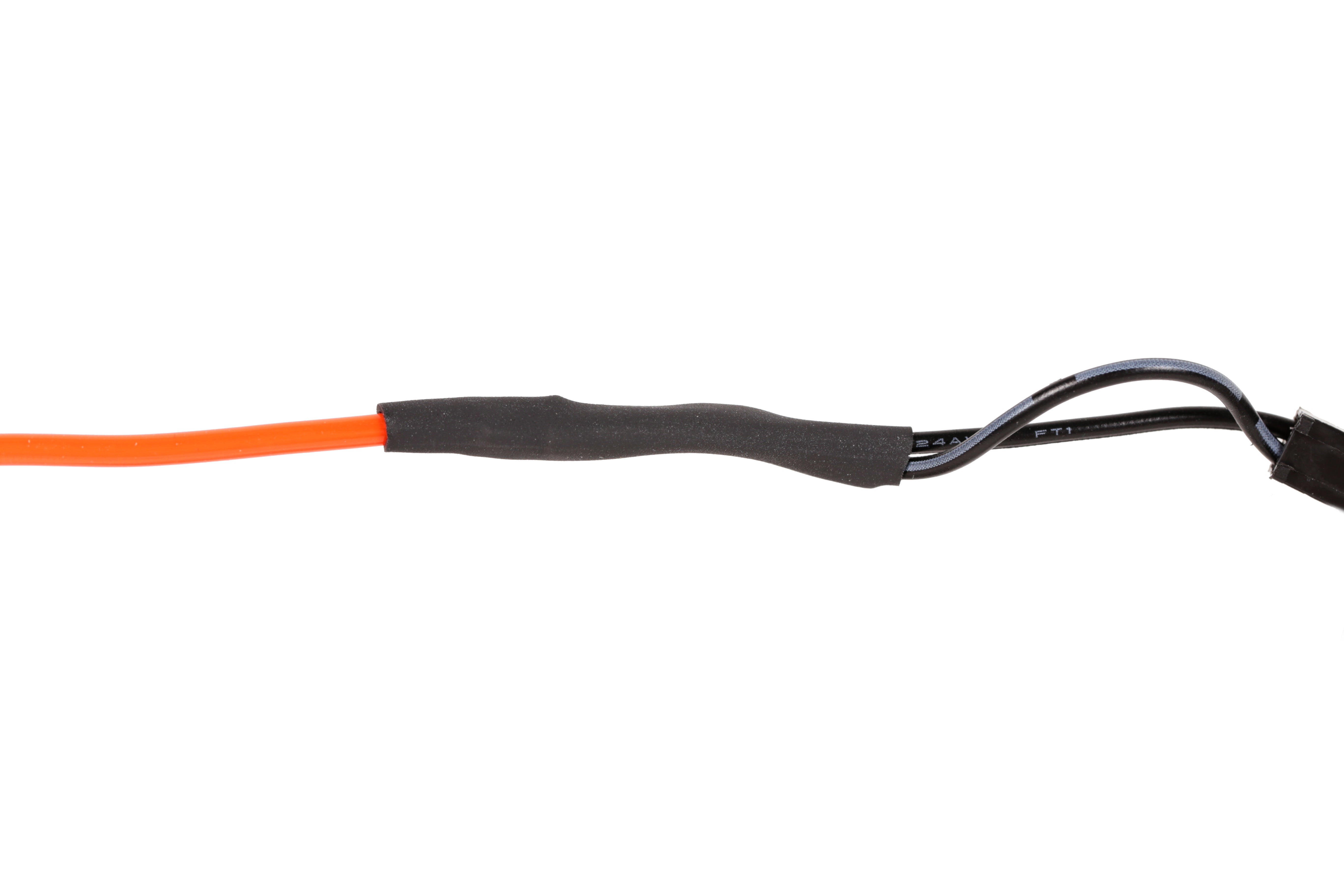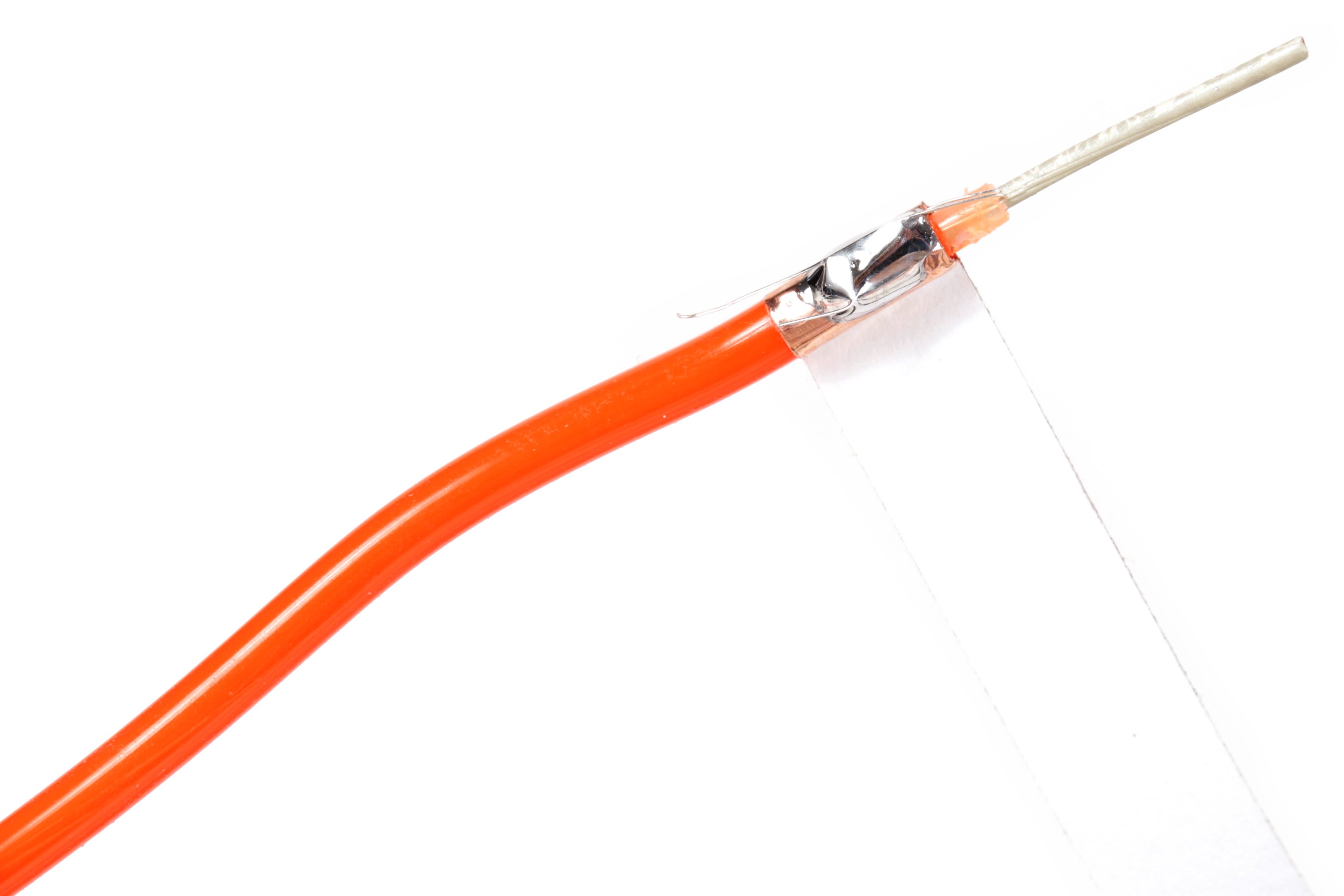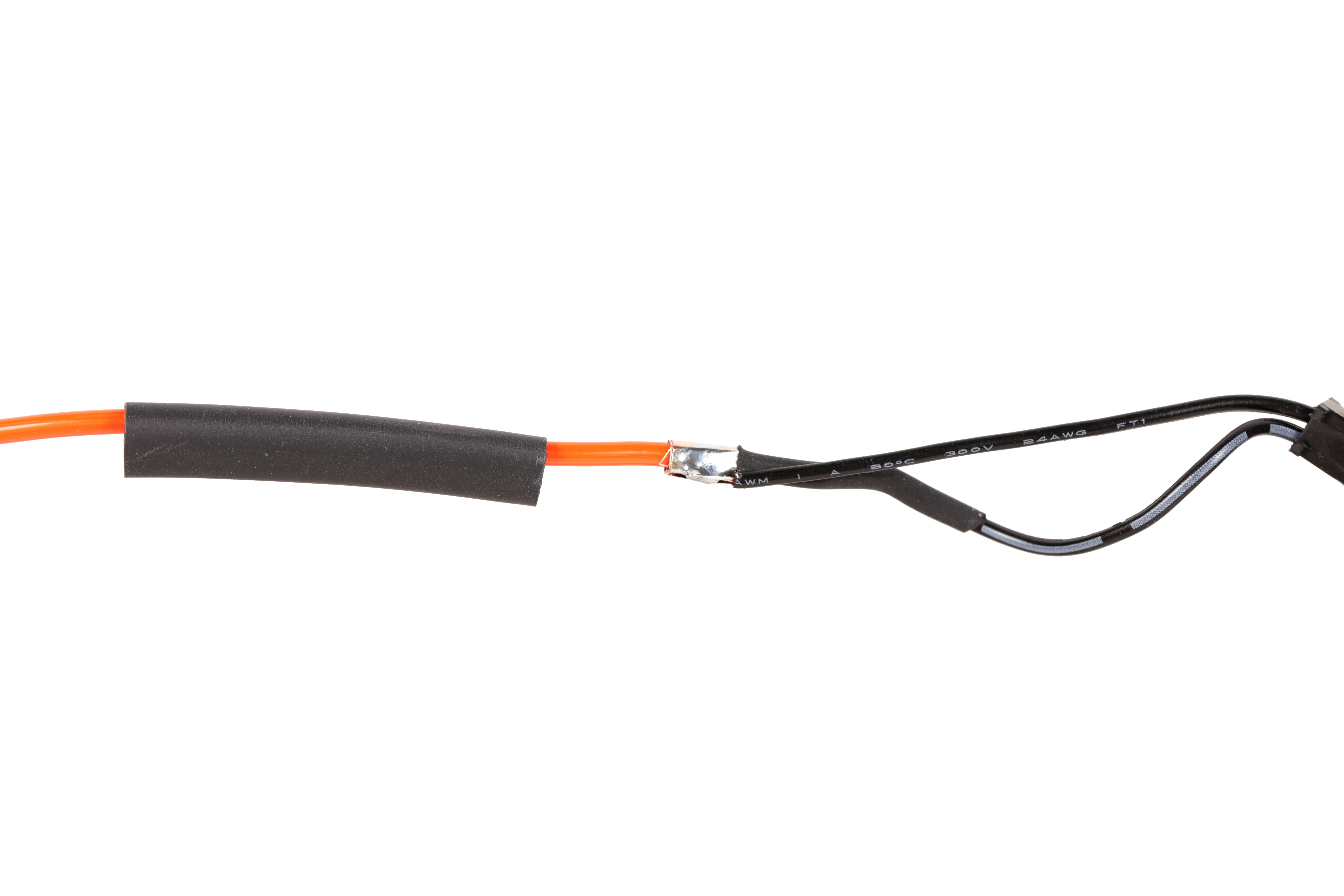 Slide the small piece of shrink tube over the center copper core and shrink it into place. Slide a larger piece of shrink tube over all of the connections and then shrink it into place.