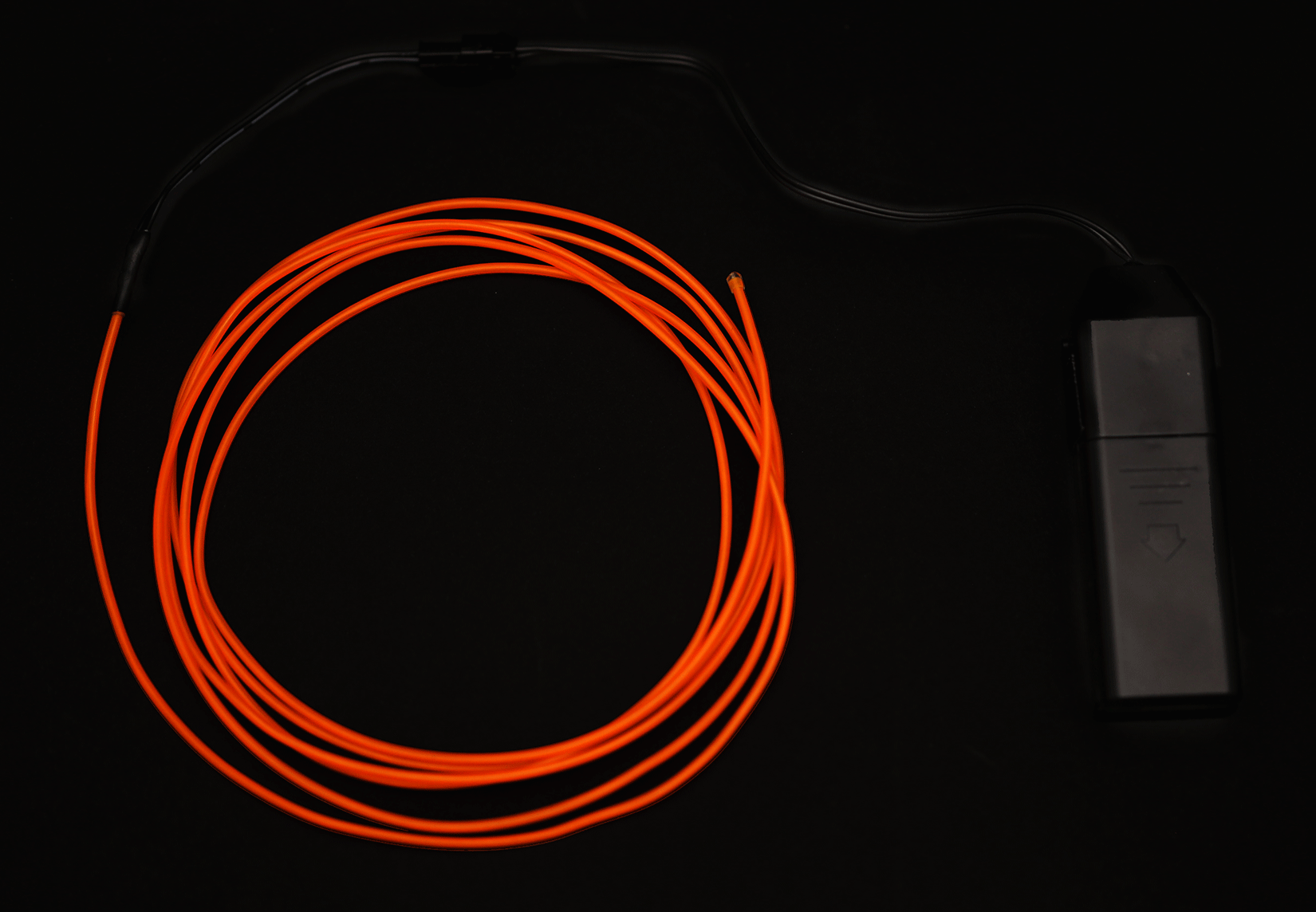 El (electroluminescent) wire is a thin, flexible, self-illuminating wire that glows along its length. It does not emit as much light as a light bulb or LED, and is not typically used as a light source. It is meant to be used as a decorative light source and is popular for costume or lighting effects. Since EL wire operates at very high voltage AC (alternating current). It offers less control and flexibility than the other light sources we have looked at, both on account of the voltage supply and the fact that it is not very bright to begin with.