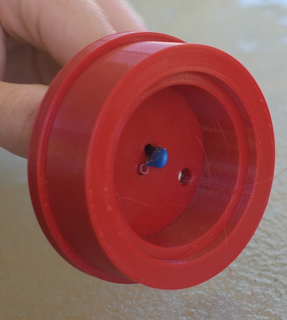 Now you should insert the thermistor into the core by sliding the 2 soldered wires through the holes closest to the center in the core so that it should look like the following: