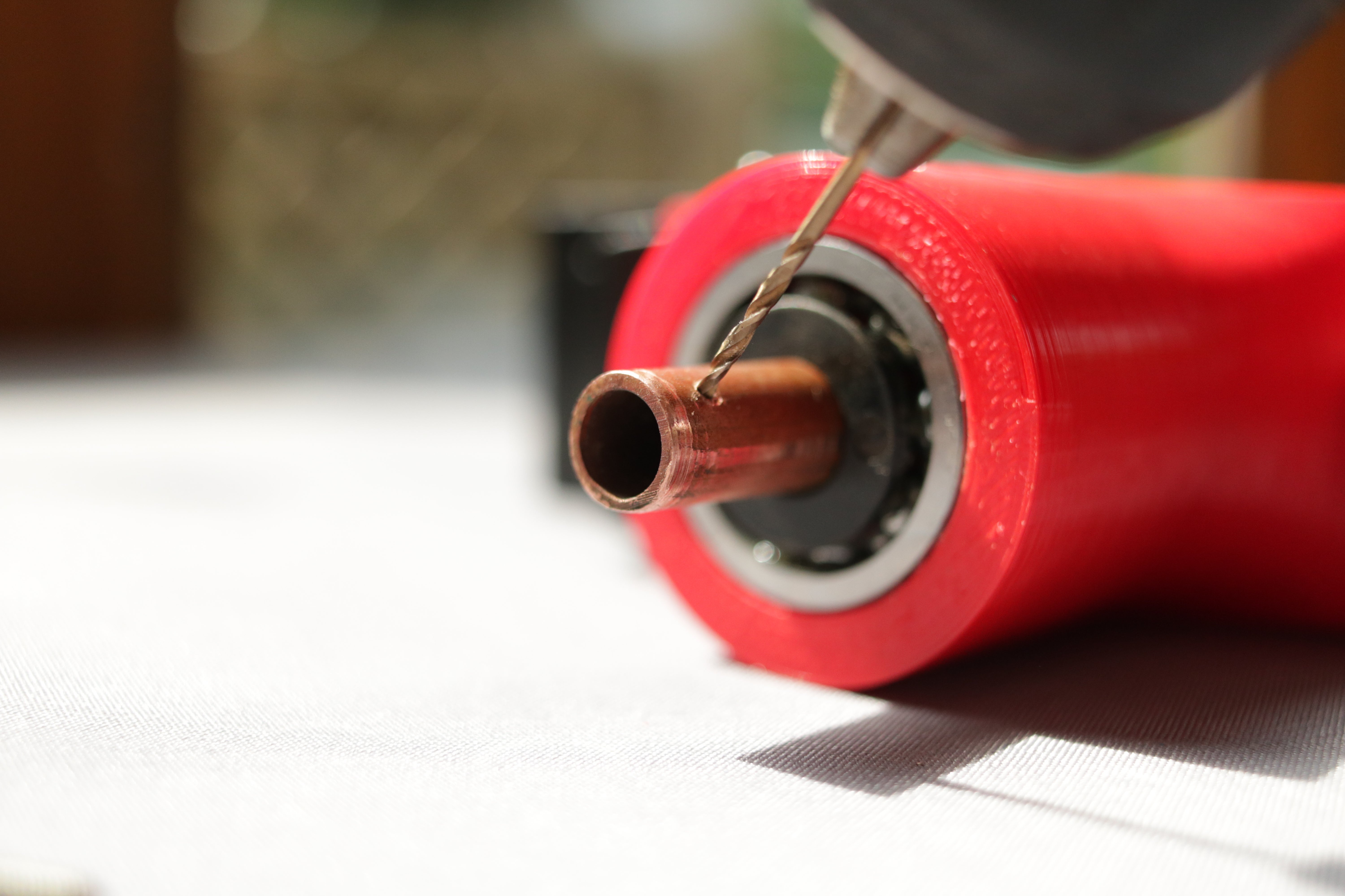 The main shaft is made from a copper tube the material is not very important but it must be a tube, you will understand why later. It has a diameter of 10mm because I had some 10-30-9 bearings (those may be oversized but it results in a very reliable revolute joint)