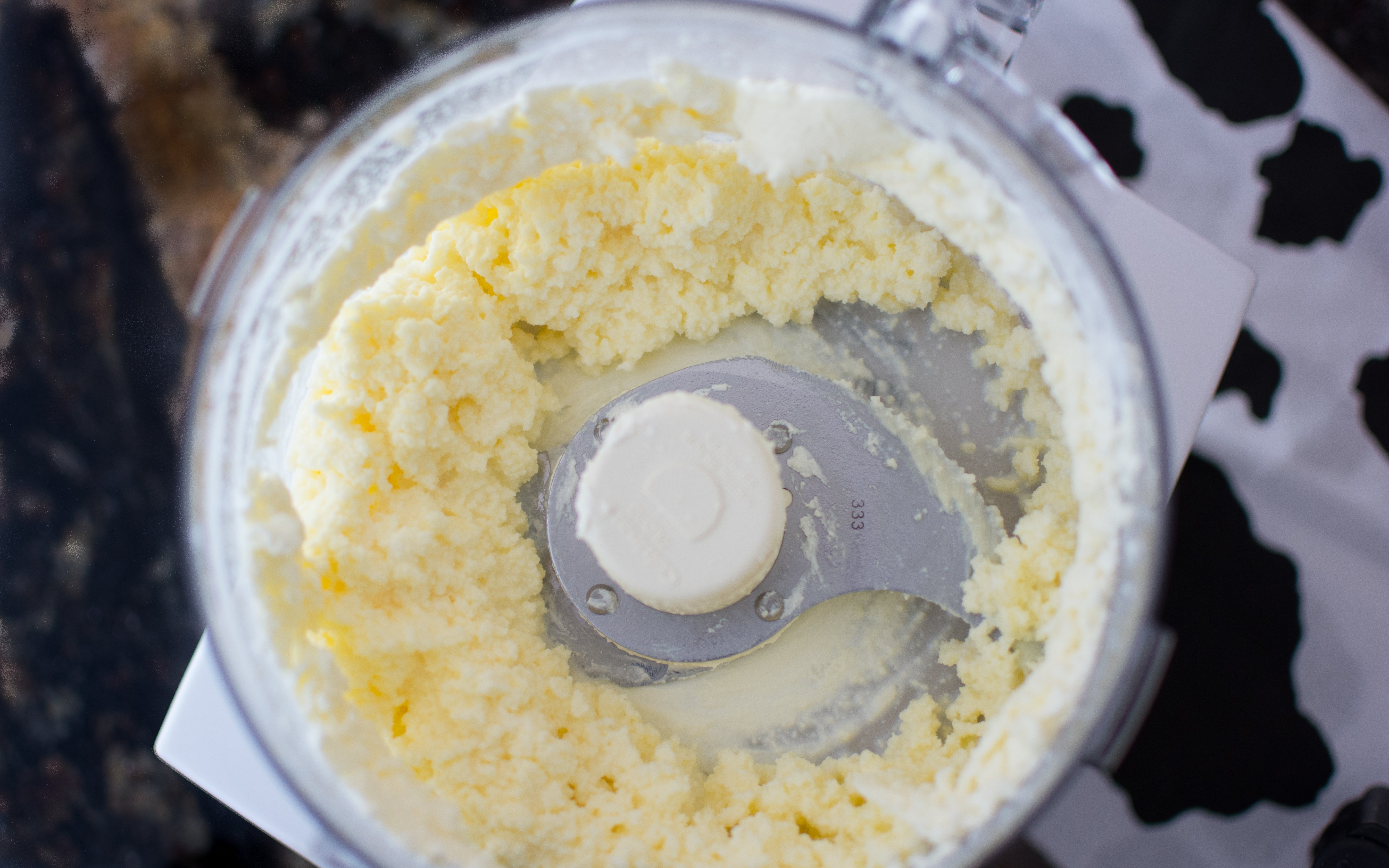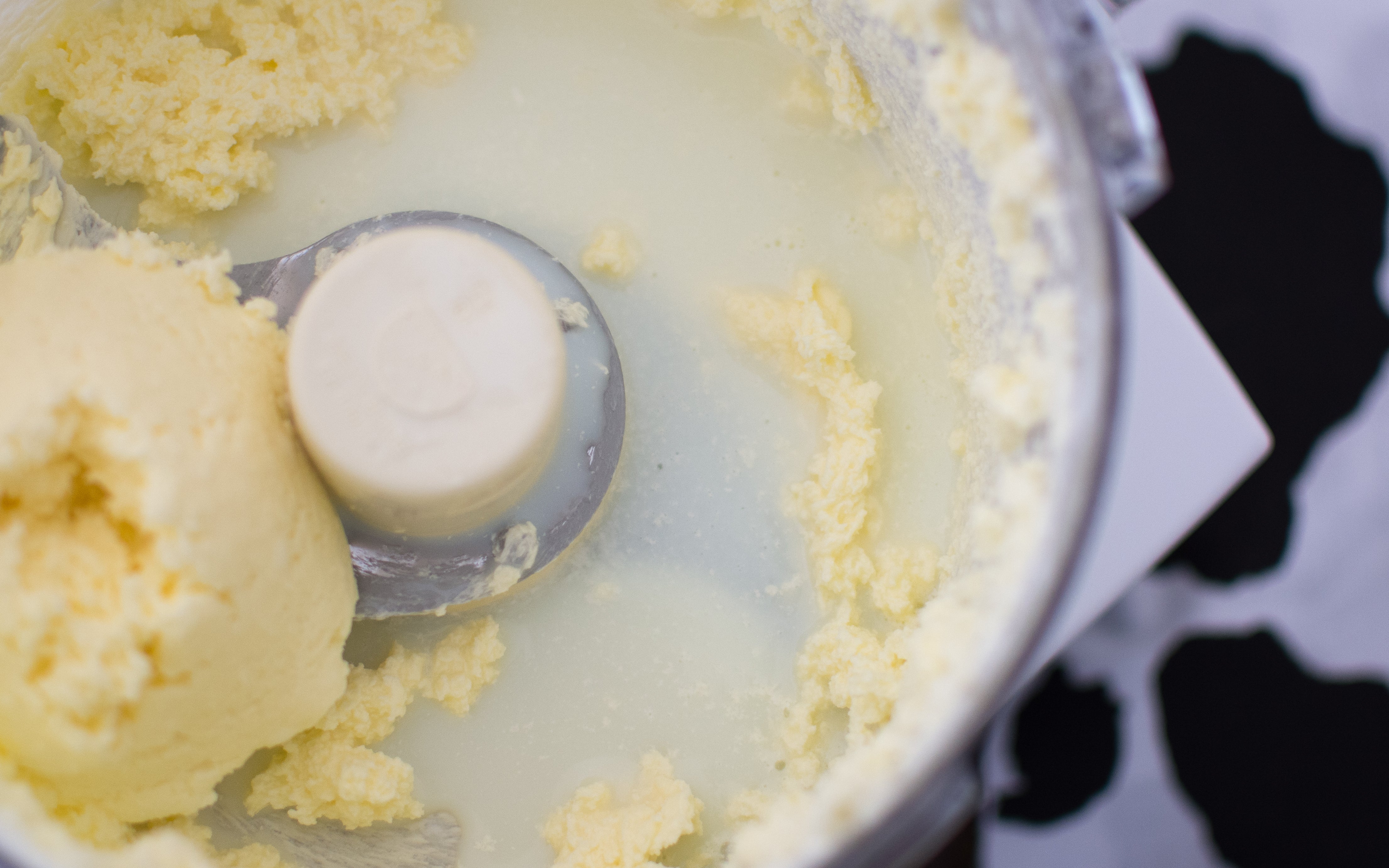 4. After another 3-4 minutes the cream will start to separate (the timing may be different depending on the power of your food processor). Keep processing (or shaking) until the butter forms into a large mass and has separated from the liquid. We aren't quite done yet, but I recommend tasting the butter at this point. You will be pleasantly surprised! :)