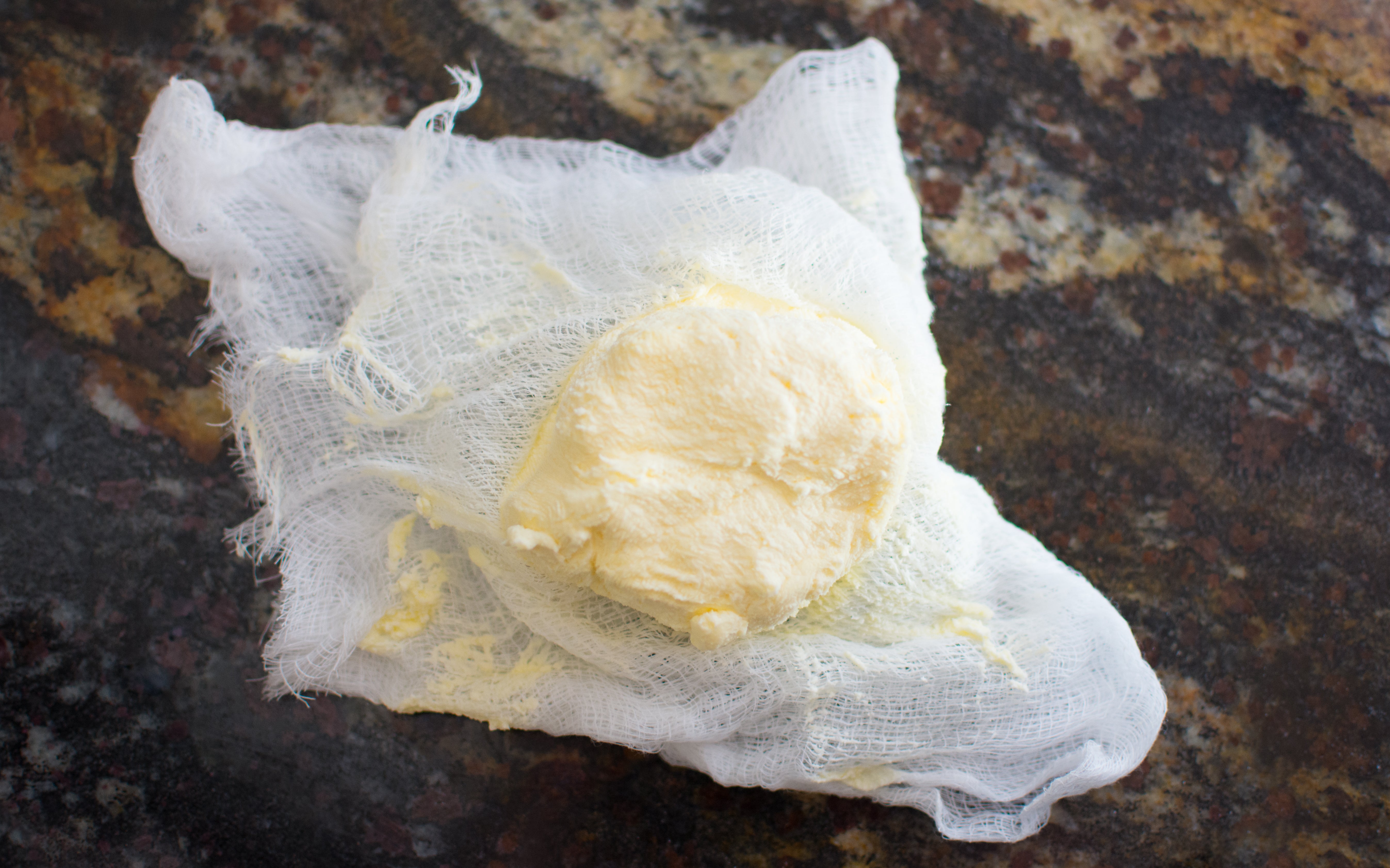 8. This step is optional but I always do it because I'm impatient! If you are like me and don't want to wait the 5-10 minutes, lift the cheesecloth out of the strainer and bring the edges to the top. Gently squeeze the butter so even more liquid is released. The drawback to this step is you have to be very careful to get all the cheesecloth fibers off of the butter. You don't want to eat those!
