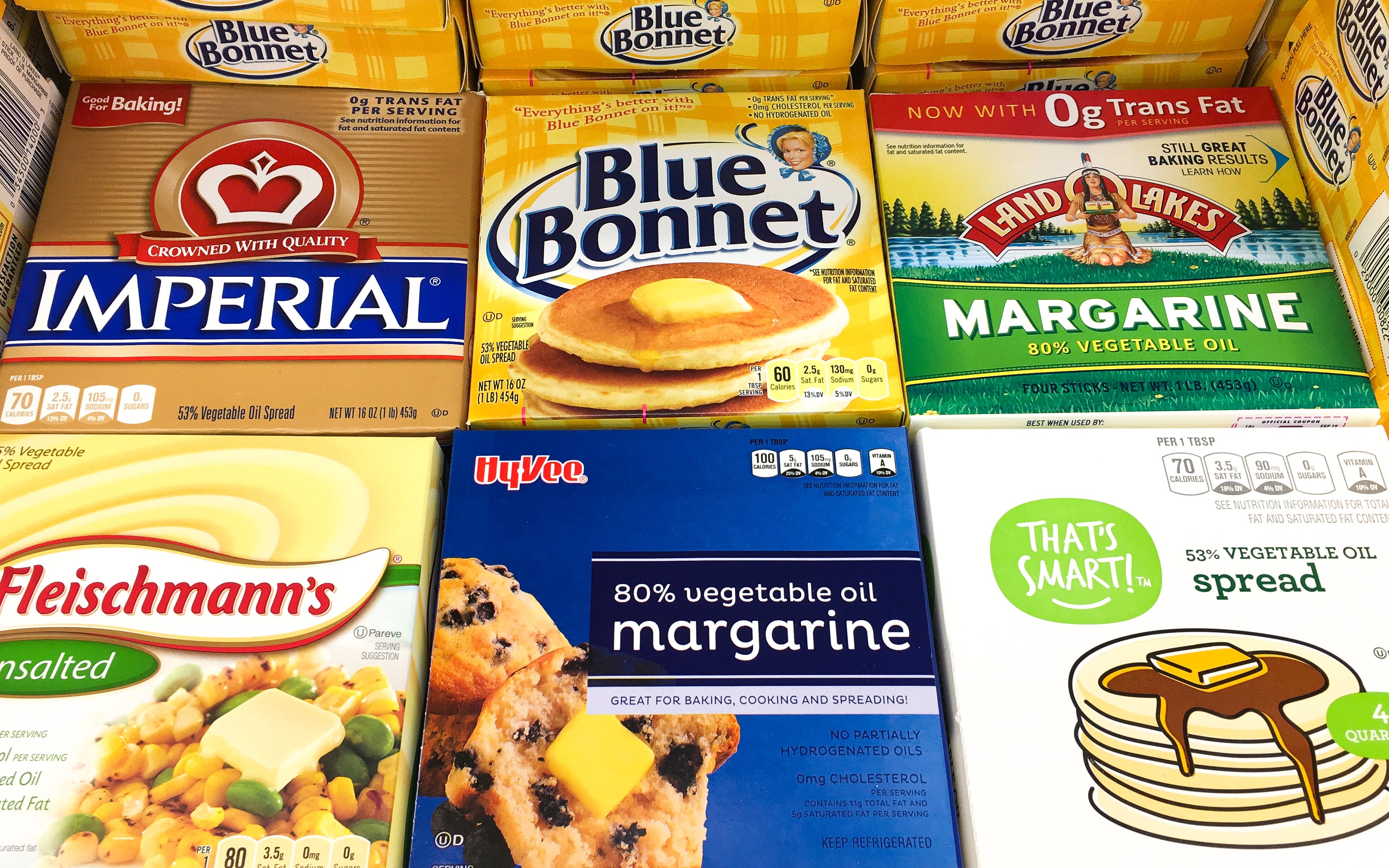 Margarine can be used in place of butter but let’s go ahead and avoid it in all baked goods! Butter is a much more flavorful options and provides some health benefits.