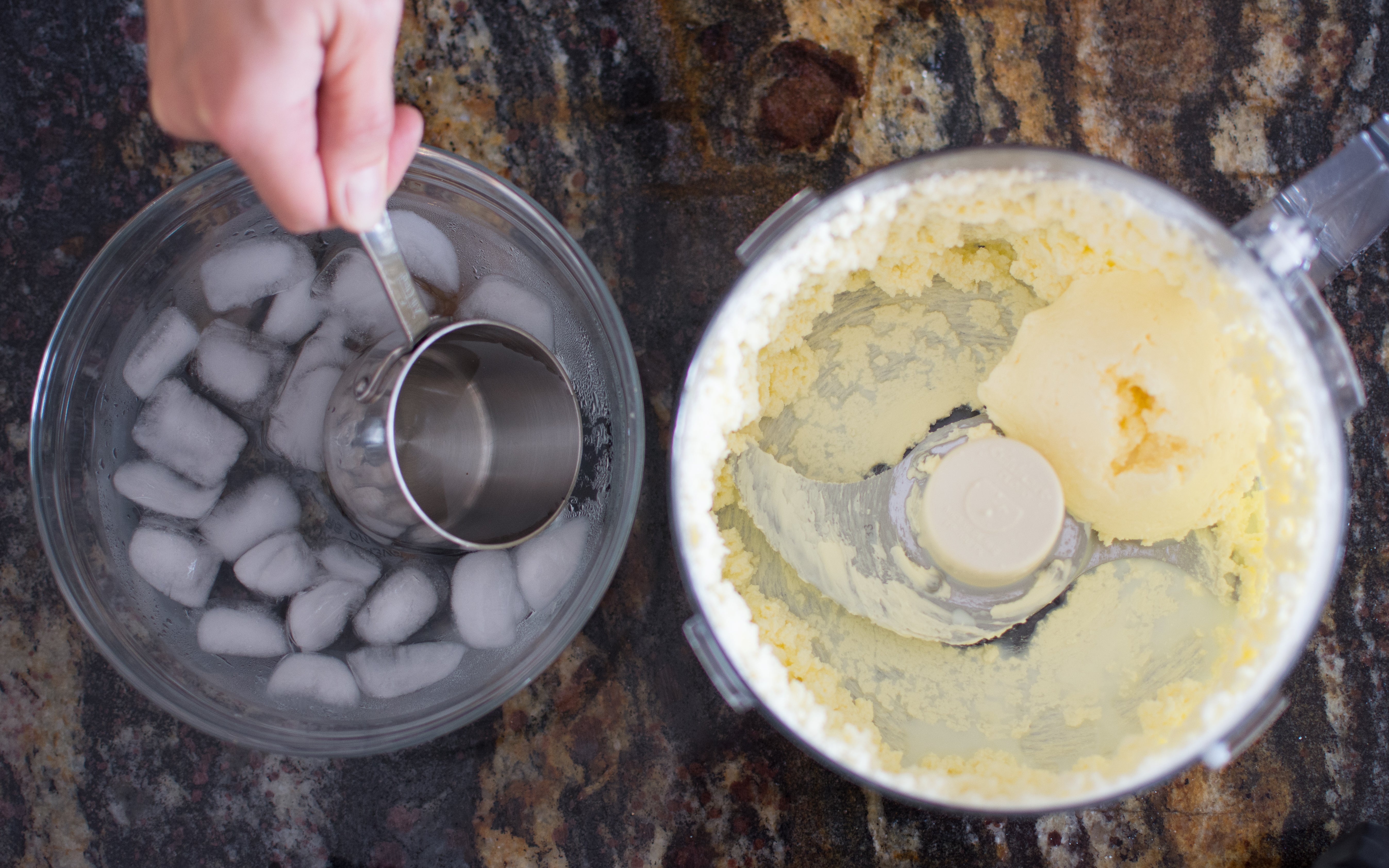 6. Add about 1/2 cup of cold water (no ice cubes please!) to the butter and process again. This step may seem strange but it's essential so the butter does not go rancid. We are technically 'washing' the butter to rinse/separate the last bit of buttermilk from the butter which helps it stay fresher longer.