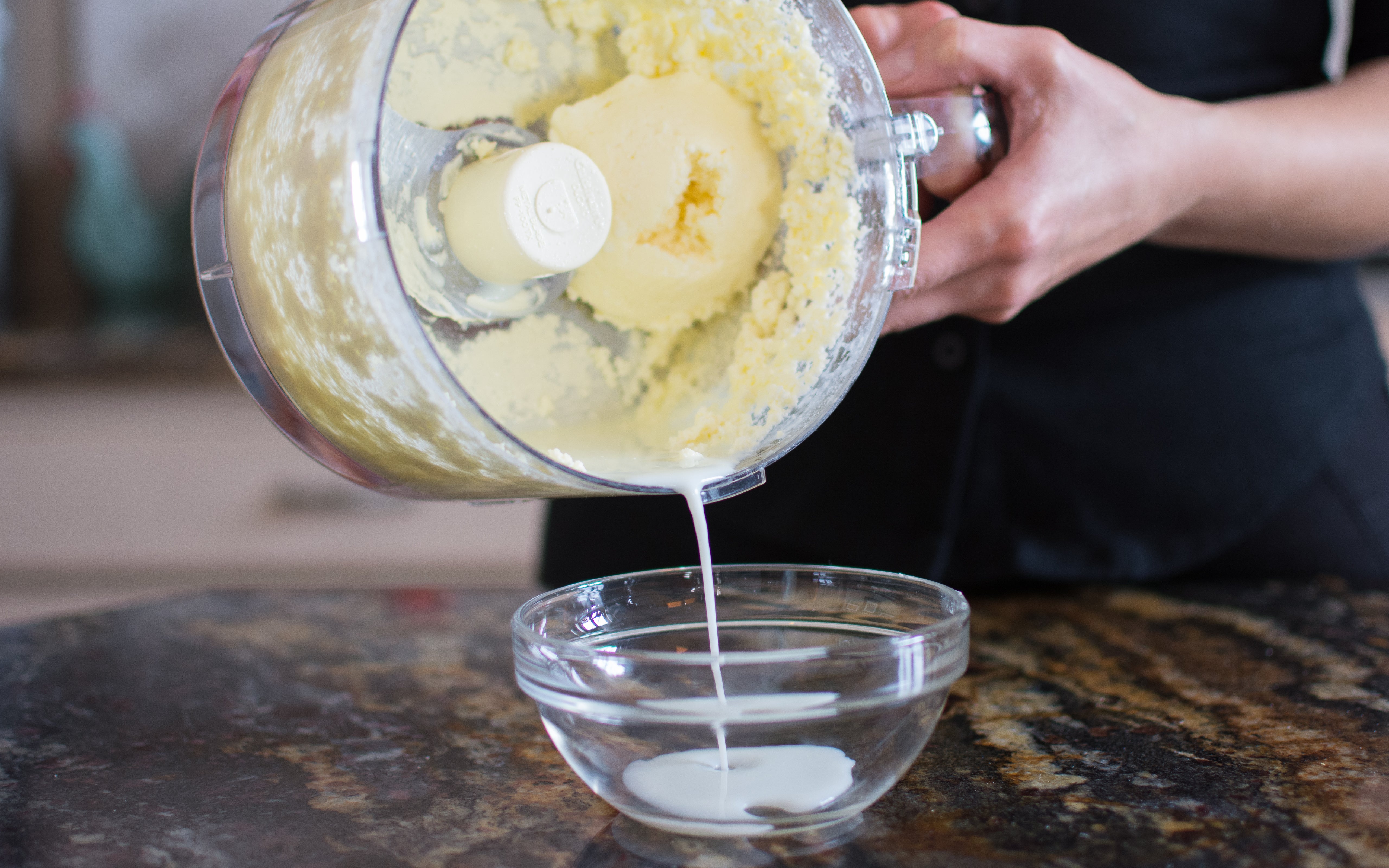 5. Stop the food processor and pour the liquid into a small bowl. KEEP this liquid. It is delicious homemade buttermilk. Use it in pancakes, muffins, biscuits, or any other recipe that calls for buttermilk or milk!