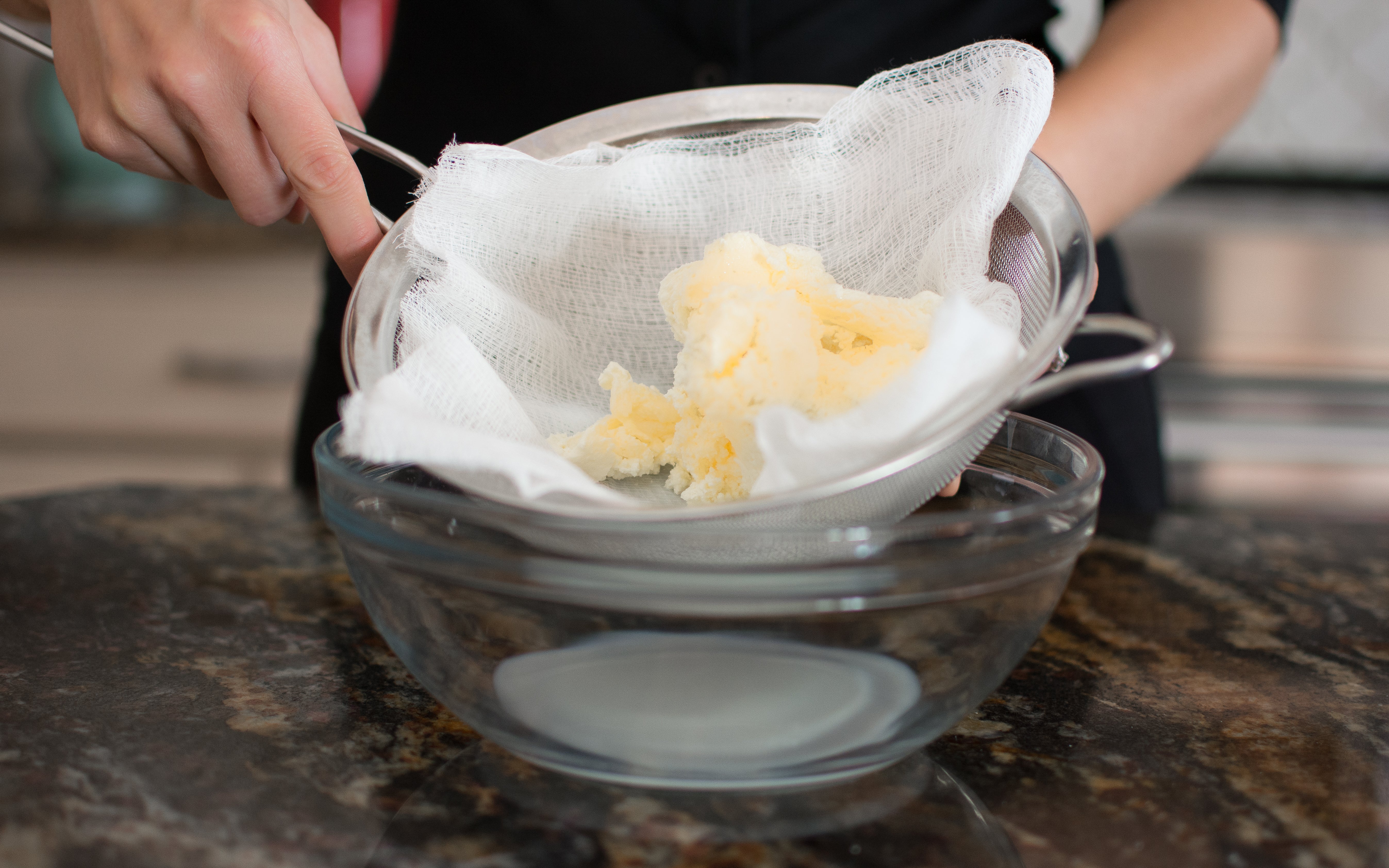 7. Place a fine mesh strainer lined with about four layers of cheesecloth in a large bowl. Pour off the water and scrape the butter out of the food processor with a rubber spatula. Let the butter stand for 5-10 minutes so all liquid drains off.