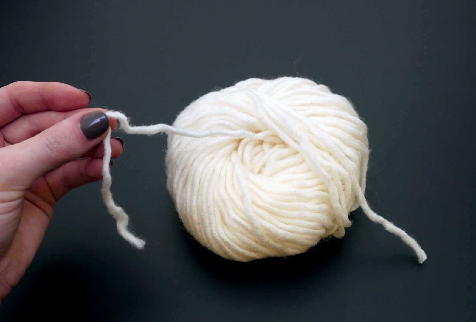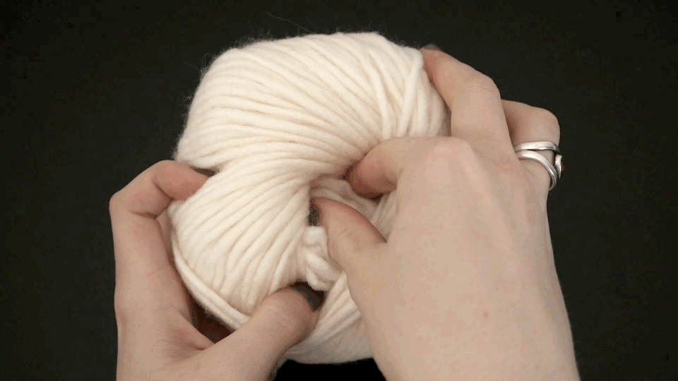 Pinch the two tails with your last three fingers while spreading your thumb and index finger apart slightly to create a taut loop of yarn around them.