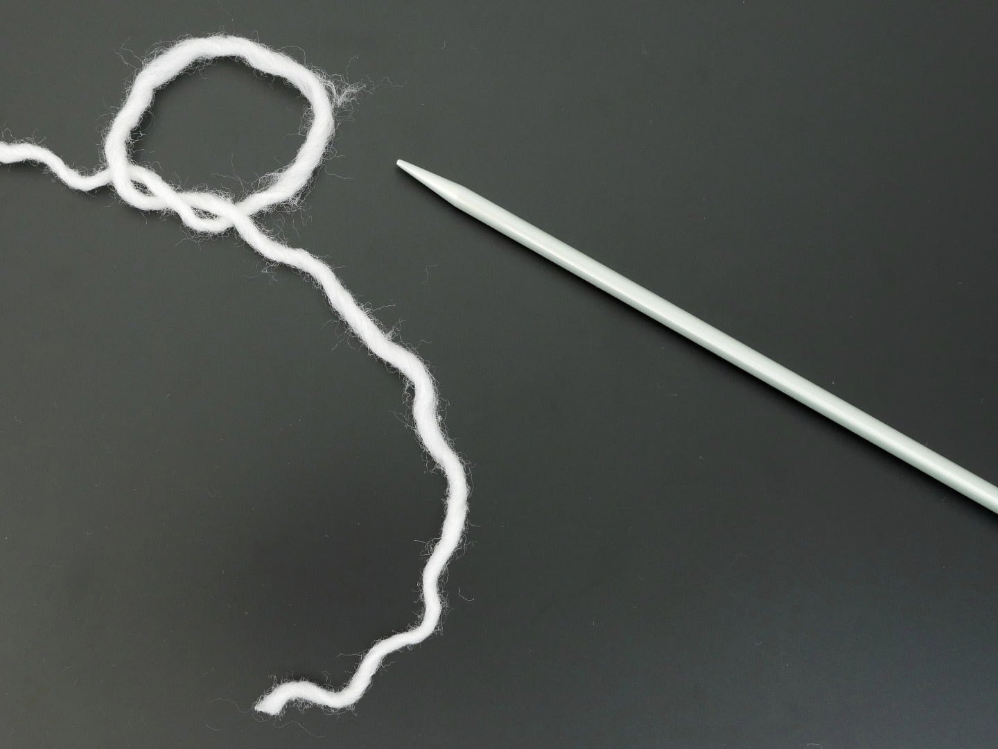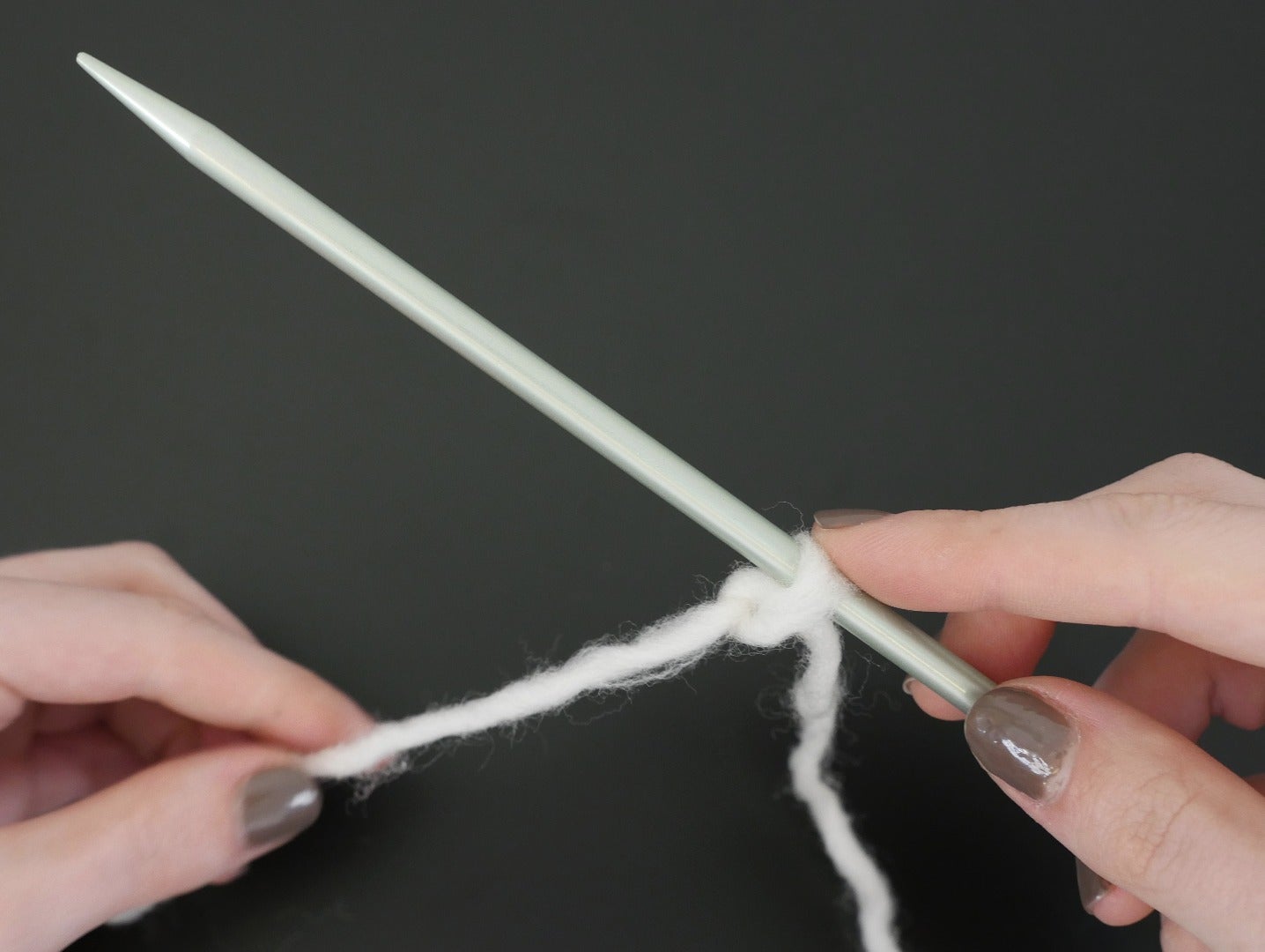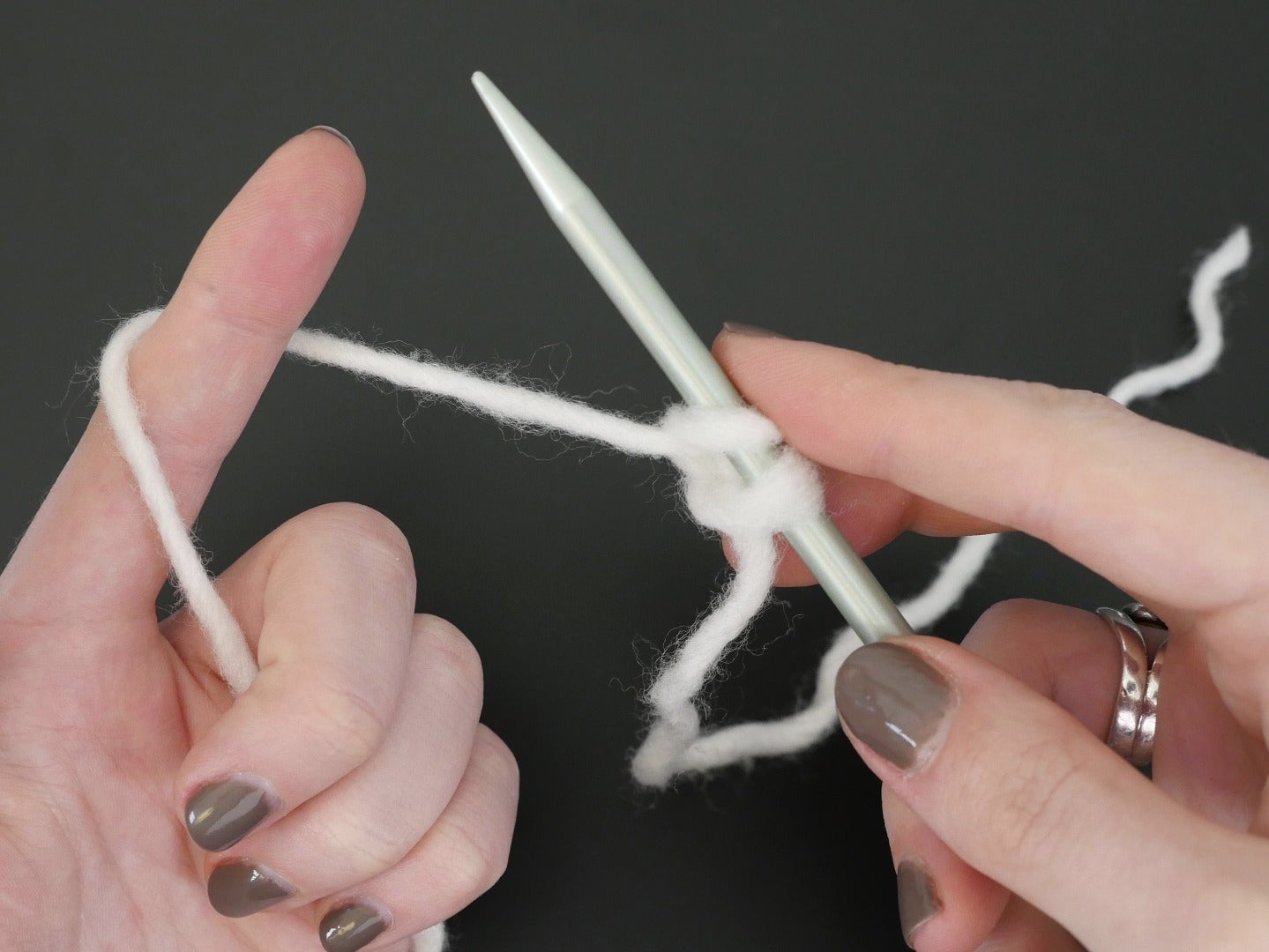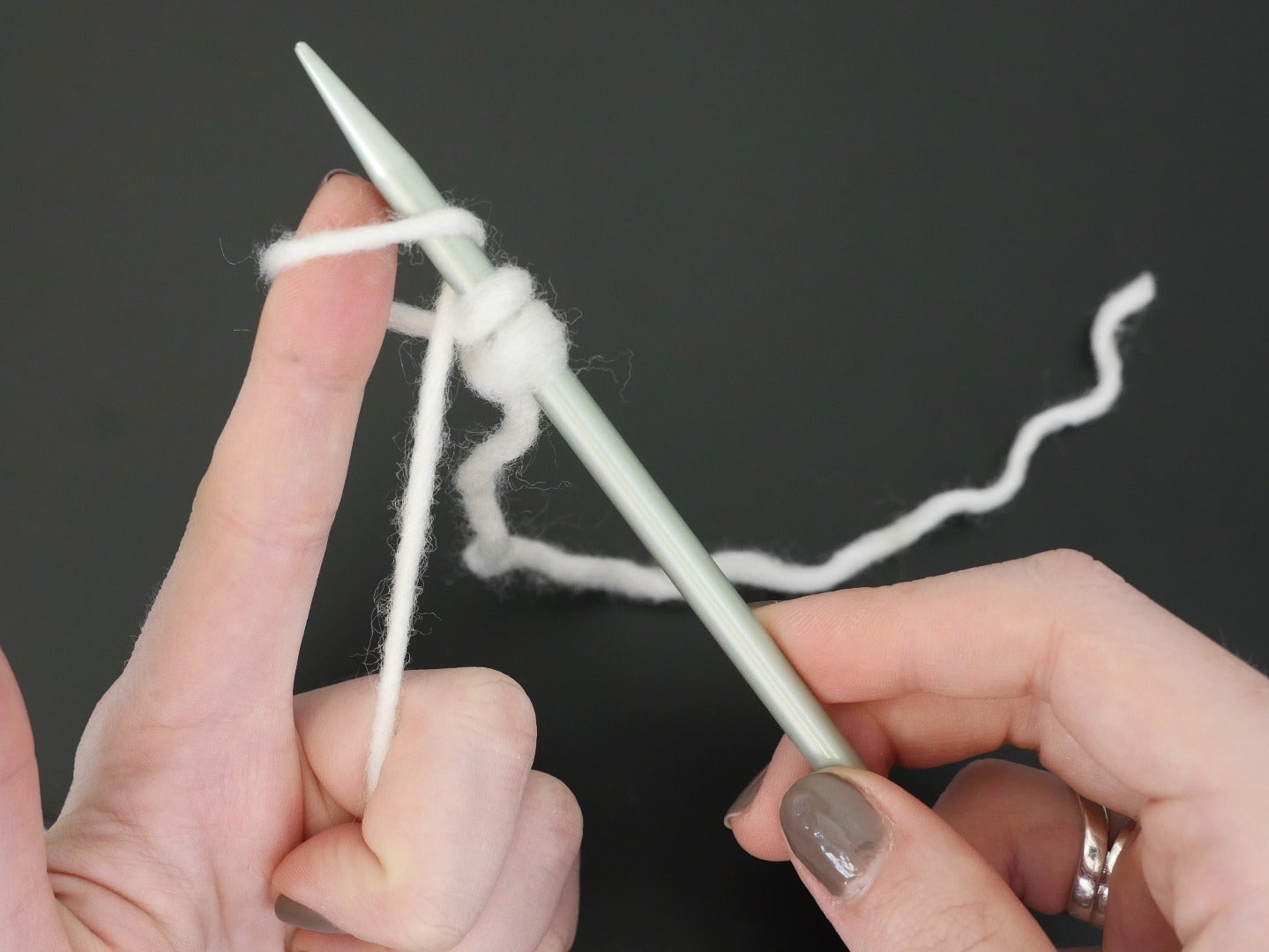 Pick up a needle with your right hand and bring it under the loop you made between thumb and index finger. Use your right index finger to pinch the yarn to the needle and lift it slightly, then rotate your needle counterclockwise towards your thumb, bringing the point to touch your thumb just below the yarn wrapped around it.