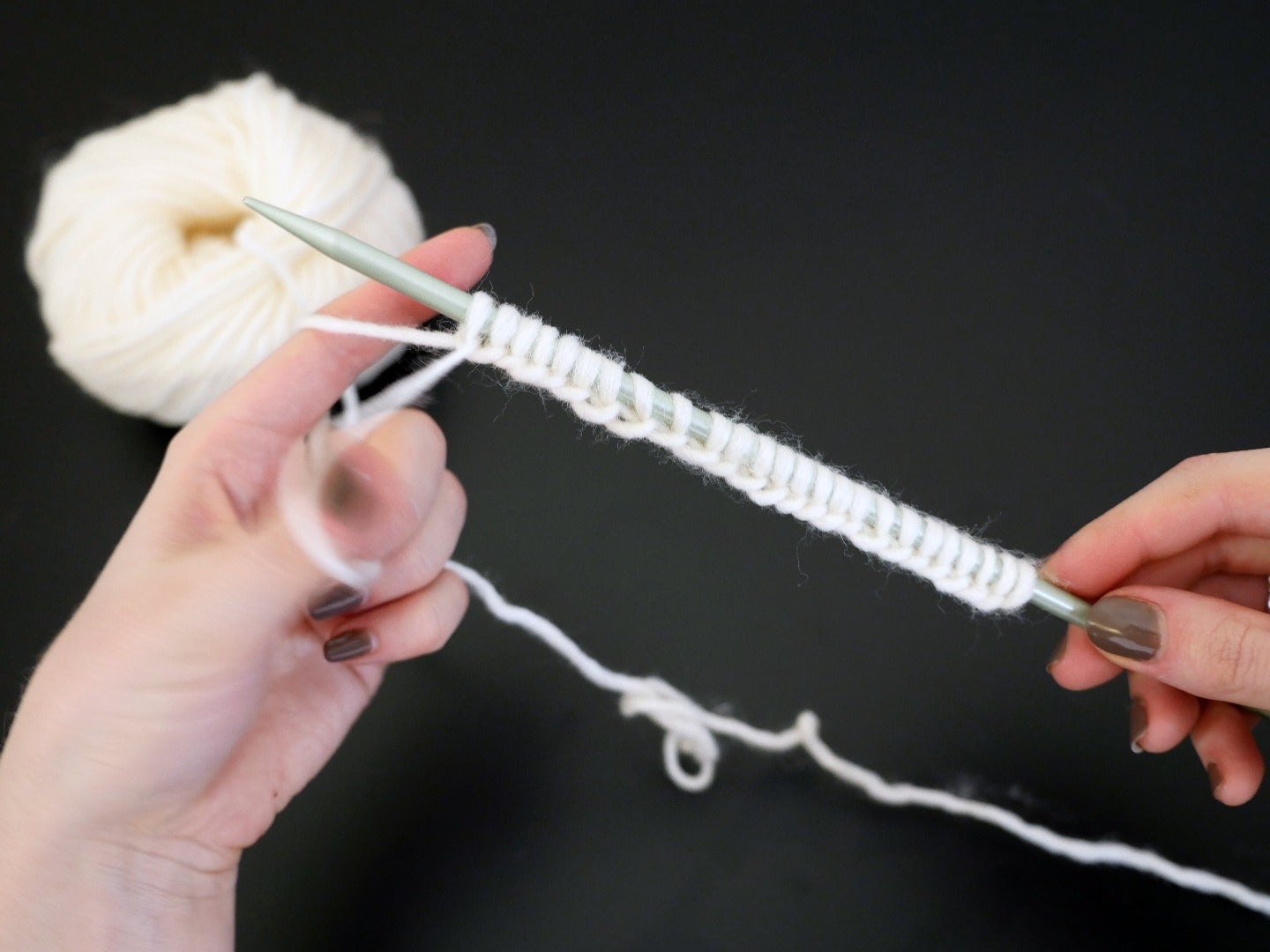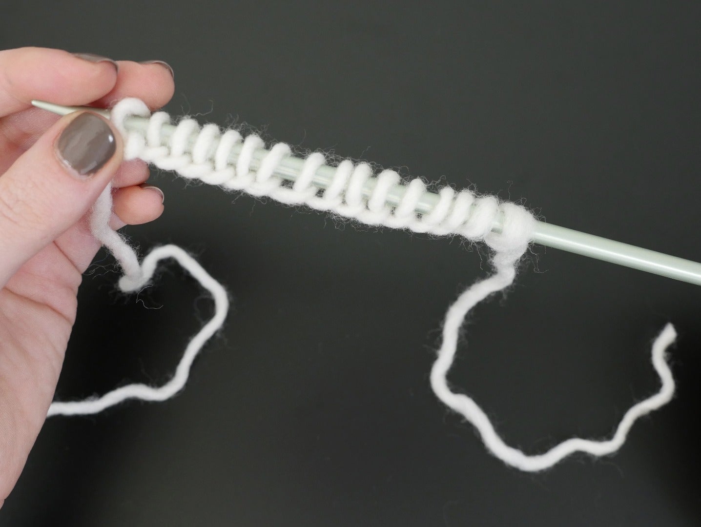 Congratulations! You only have to do this once at the beginning of a project, and casting on is harder than actual knitting. Give yourself a pat on the back, snap a photo of your first row, and take a short break. How's your posture? Now that you've got the stitches on the needle, let's get to knitting the rest of the scarf!