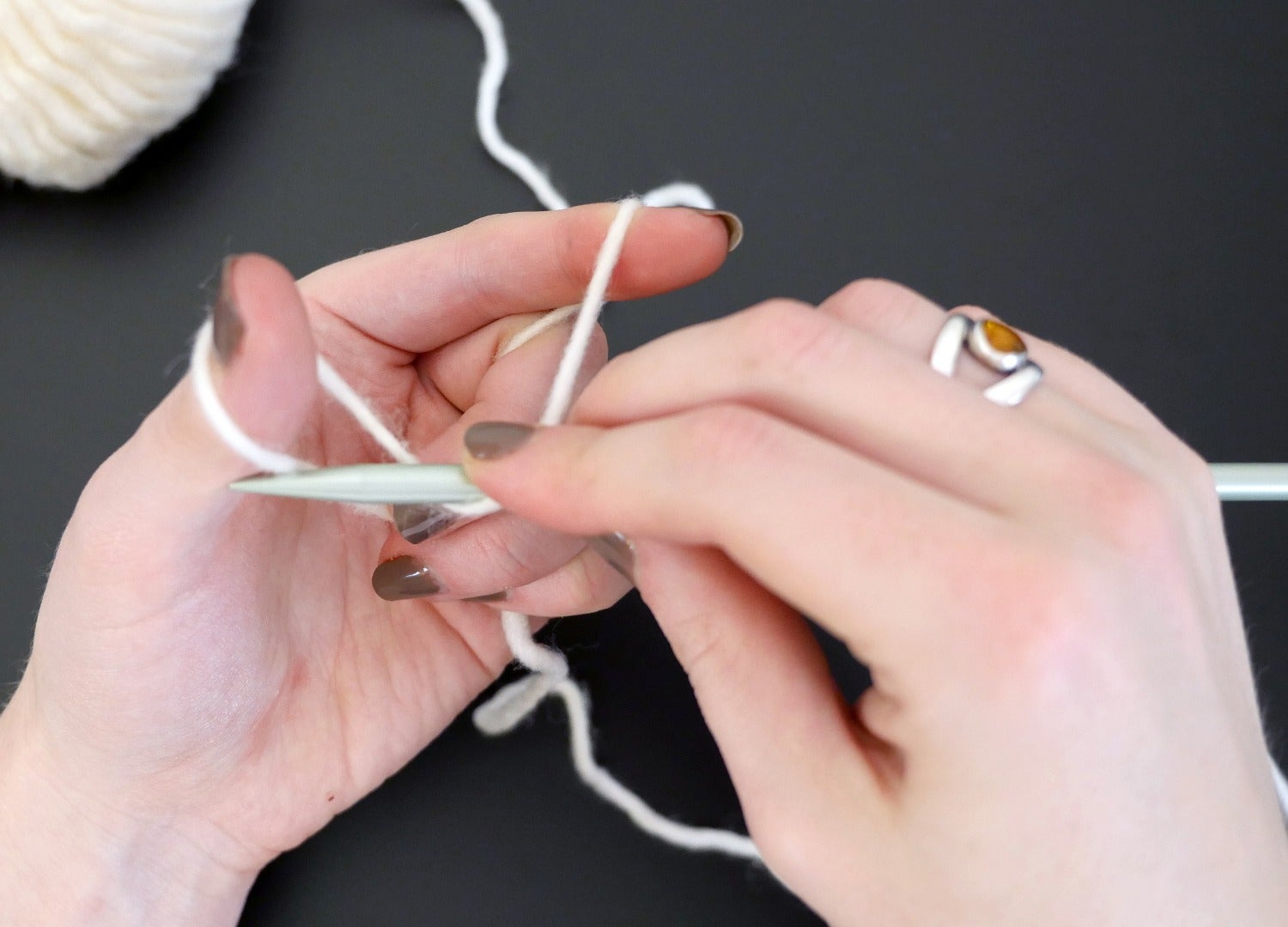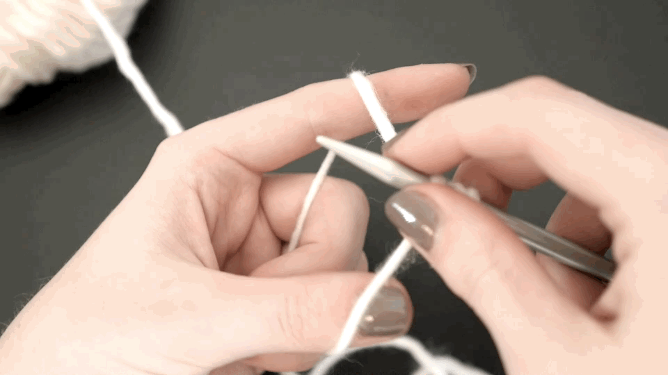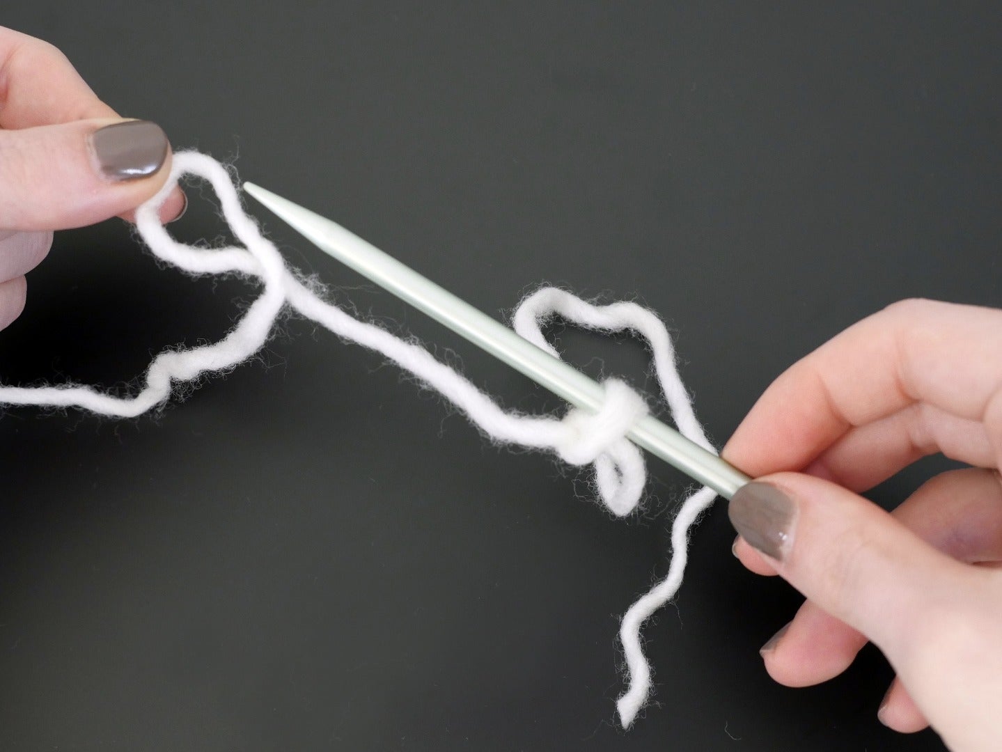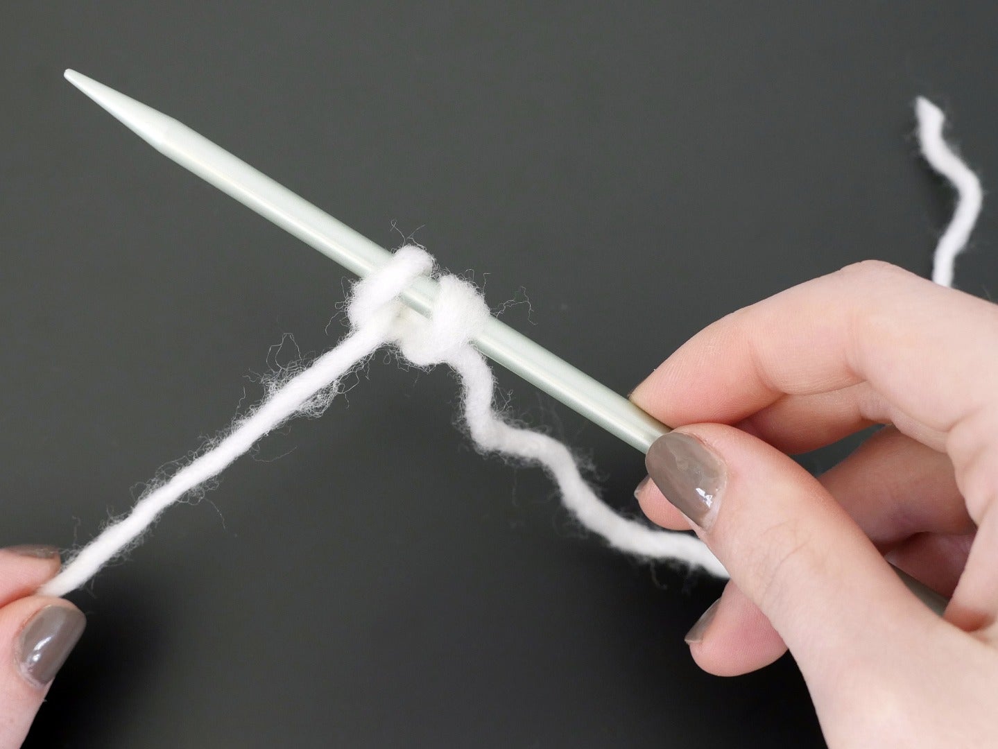 Rotate your needle counterclockwise again, returning through the thumb loop and then release the loop from your thumb. Pull the yarn tight and readjust yarn hold.