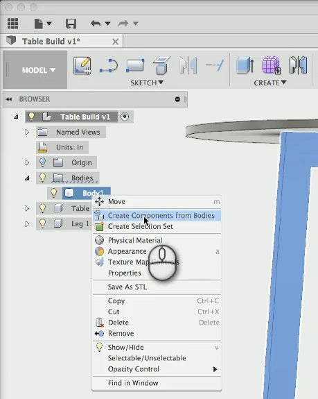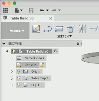 Now that your leg is done, click the circle next to the Top-Level Component in the Browser. This will be the first item in the list. At this point you should have two components under the top level- the leg and the tabletop.