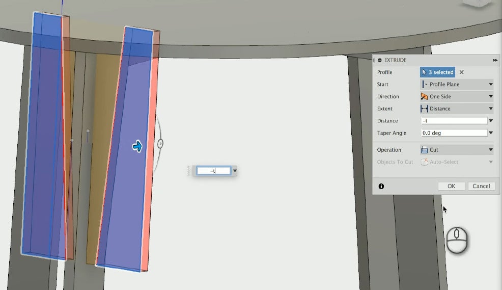 Turn off the crossing table leg component in the Browser, then go to CREATE > Extrude and select the top part of the tab sketch. Pull the arrow into the component so that it cuts through, and you'll see that this will be a negative value. Enter t for the Distance, and leave Operation on Cut.