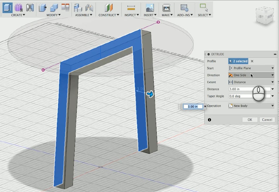 Use the side profile you just made to Extrude the part. Be sure to use the t parameter and extrude it in the correct direction. The Operation should be New Body.