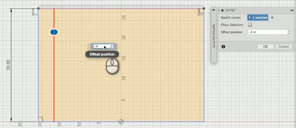 The idea is the same for tables. Work backwards from the rectangle you just made to create this recess. Go to SKETCH > Offset, unchenck Chain Selection, and select one of the vertical lines. This will offset the line parallel to the original by a distance you specify. A 4" (100mm) offset will give you enough room to avoid stubbing your toes without sacrificing too much stability. Notice by pulling the arrow that you will probably need to enter a negative value since you're offsetting to the inside of the rectangle.
