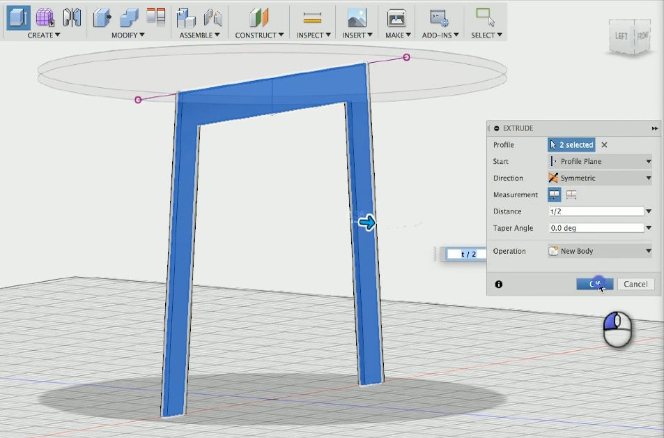 Go to SKETCH > Extrude and click on both of the profiles separated by the mirror line. If you pull on the arrow, you'll see that the 3D part will be extruded in one direction only. You want the table leg part to be aligned with the center of the table, so you'll need to do an extrusion that does in both directions and still has the t thickness parameter.