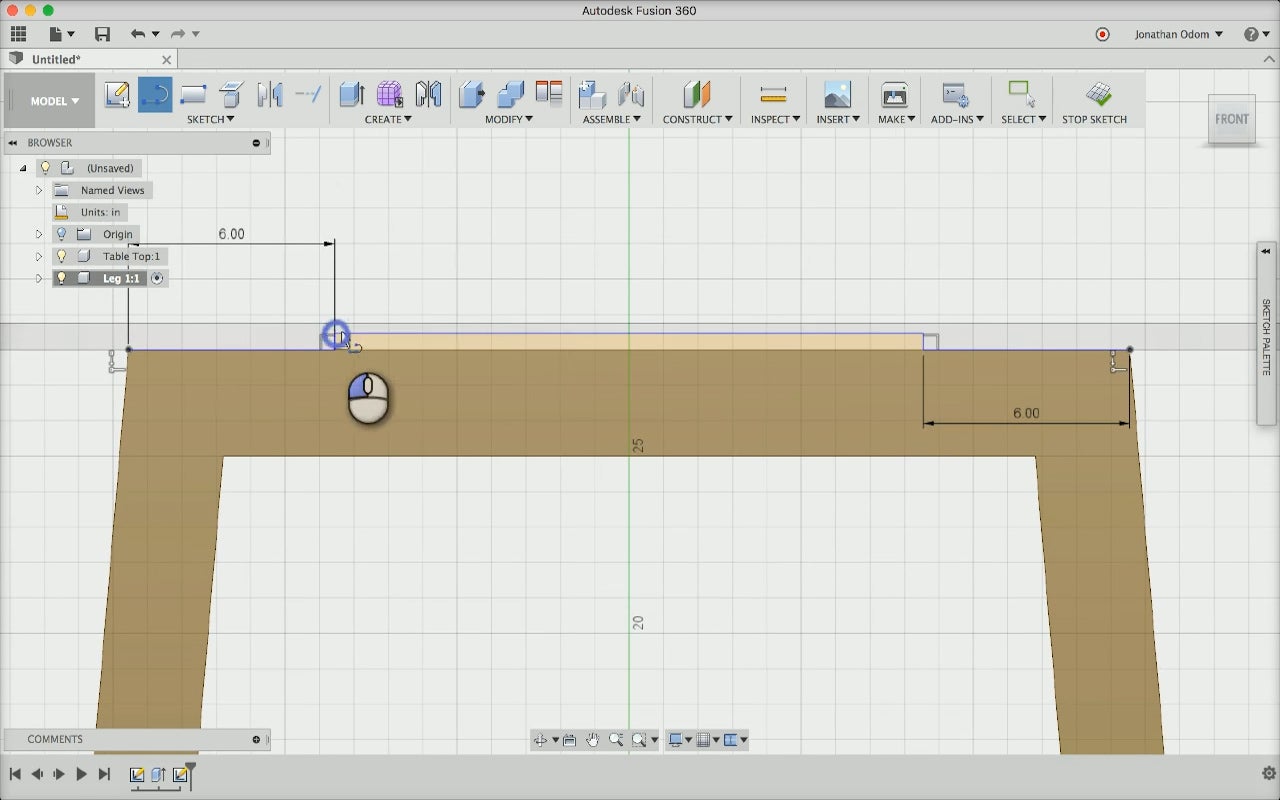 Draw another 6" line on the other side, then draw a tab that looks about half way through the depth of the table top. Make sure all the angles are 90º! The cursor should snap to 90º automatically.