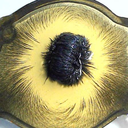 This attempt used a slightly stronger ceramic block. Here, I poured the filing-containing resin directly onto the magnet, rather than letting it flow in from the sides. This led to a clump of filings on the magnet, and relatively few elsewhere. It has an interesting look, but isn't good for handing to others since some sharp points of iron filings are exposed.
