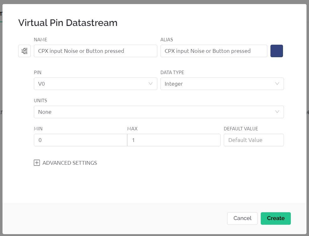 7. Now you should have a virtual pin called V0 named "CPX Input Noise or Button Pressed".
