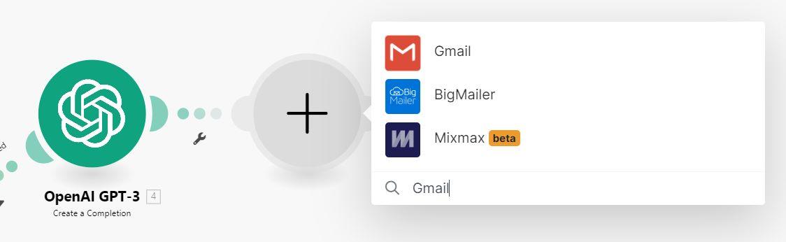 9. Connect a new module to the right of the ChatGPT module and search for "Gmail".