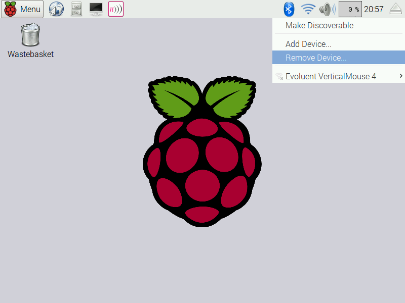 Turn on the Bluetooth device you would like to connect to the Pi to make it discoverable. Click on the Bluetooth icon in the upper right corner and choose Add Device from the menu.