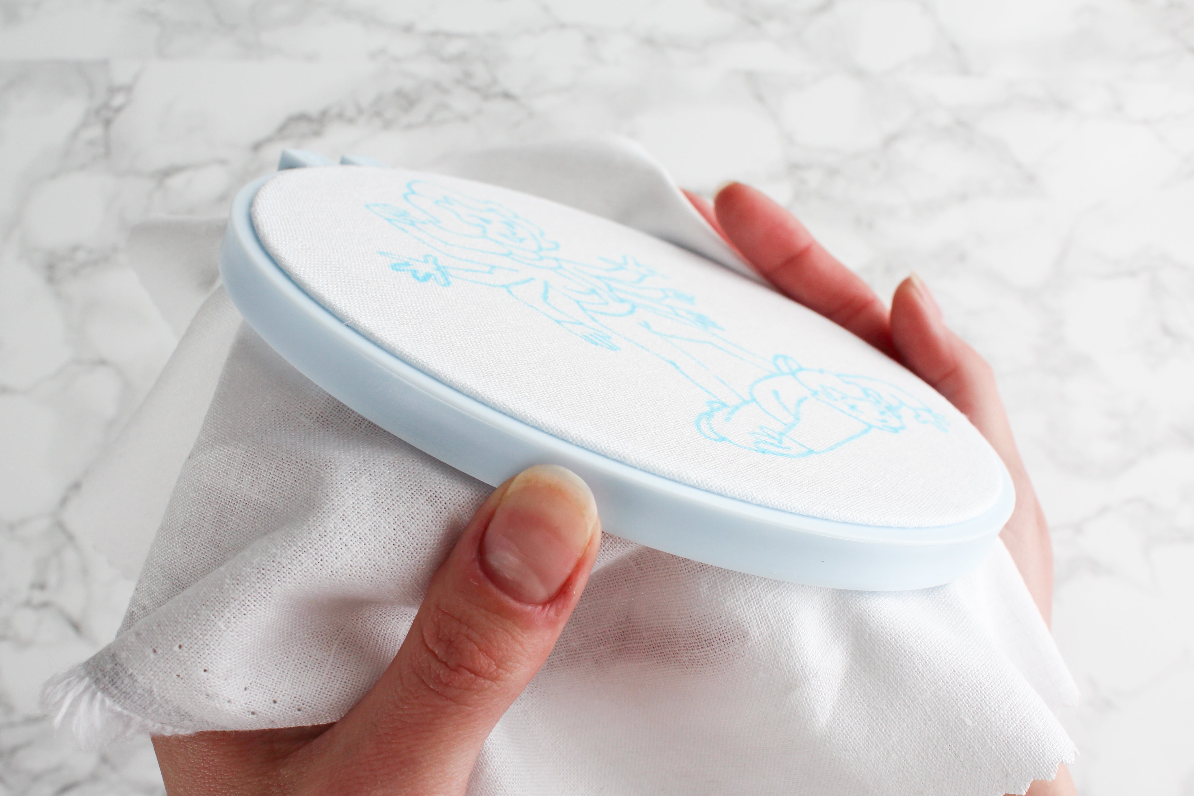 Begin to gently pull at the fabric, moving all the way around the hoop, so the embroidery pattern remains centered and the fabric becomes taut.