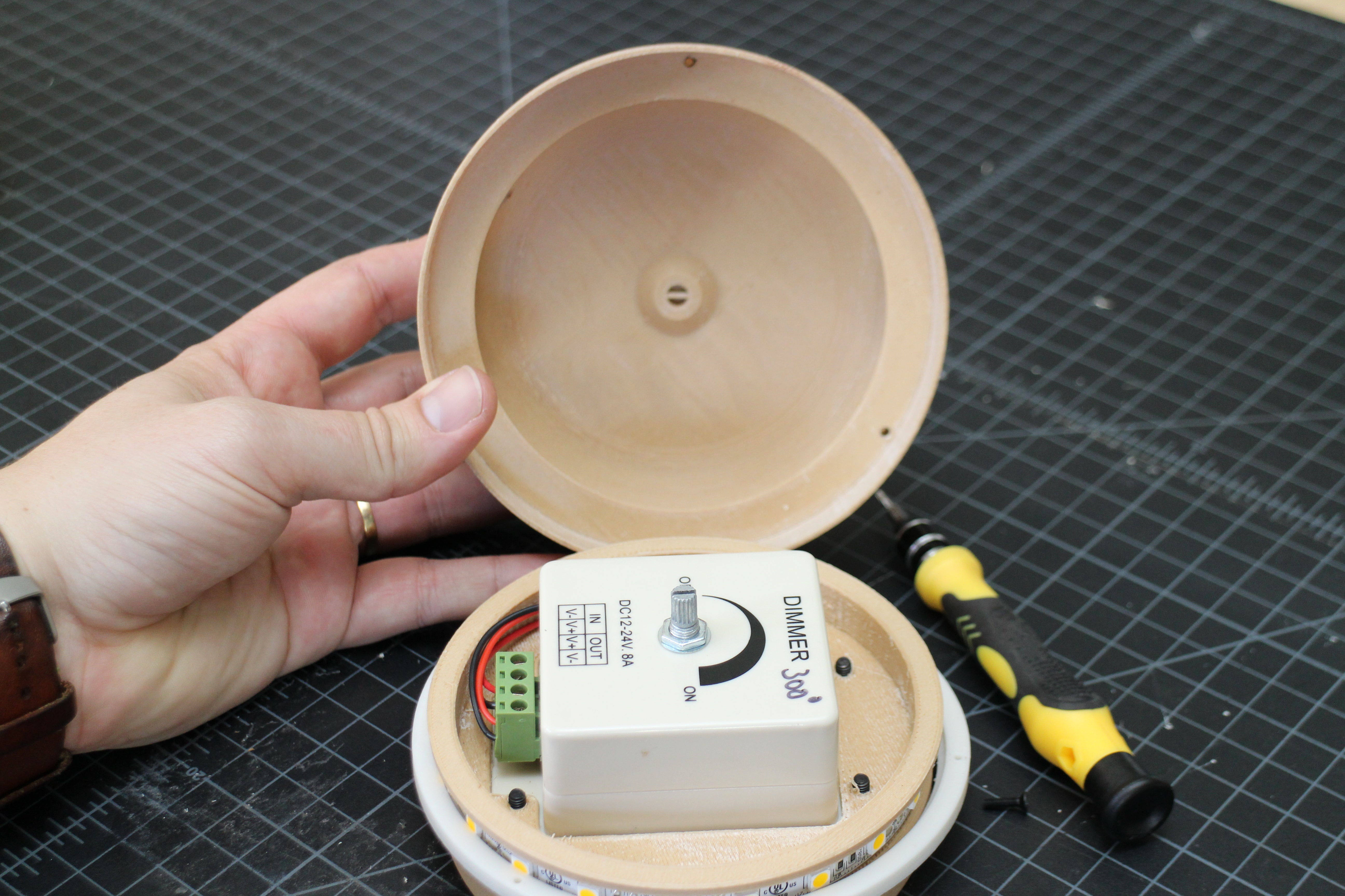 The design is pretty simple, it's a base with a dimmer built in, and a cap that acts as a giant knob. There's a ring on the inside that keep the knob cap in place, and the knob cap plugs into the potentiometer post on the dimmer. With the base stationary, twisting the knob cap turns the potentiometer and dims the LEDs.