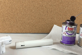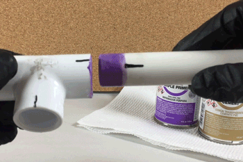 The primer solvent etches the inside slot of the pipe fitting and the outside of the pipe. The purple primer stains, like really stains, so that's why I like to work with clear primer, but for the sake of this demo, I'll be using the purple primer.