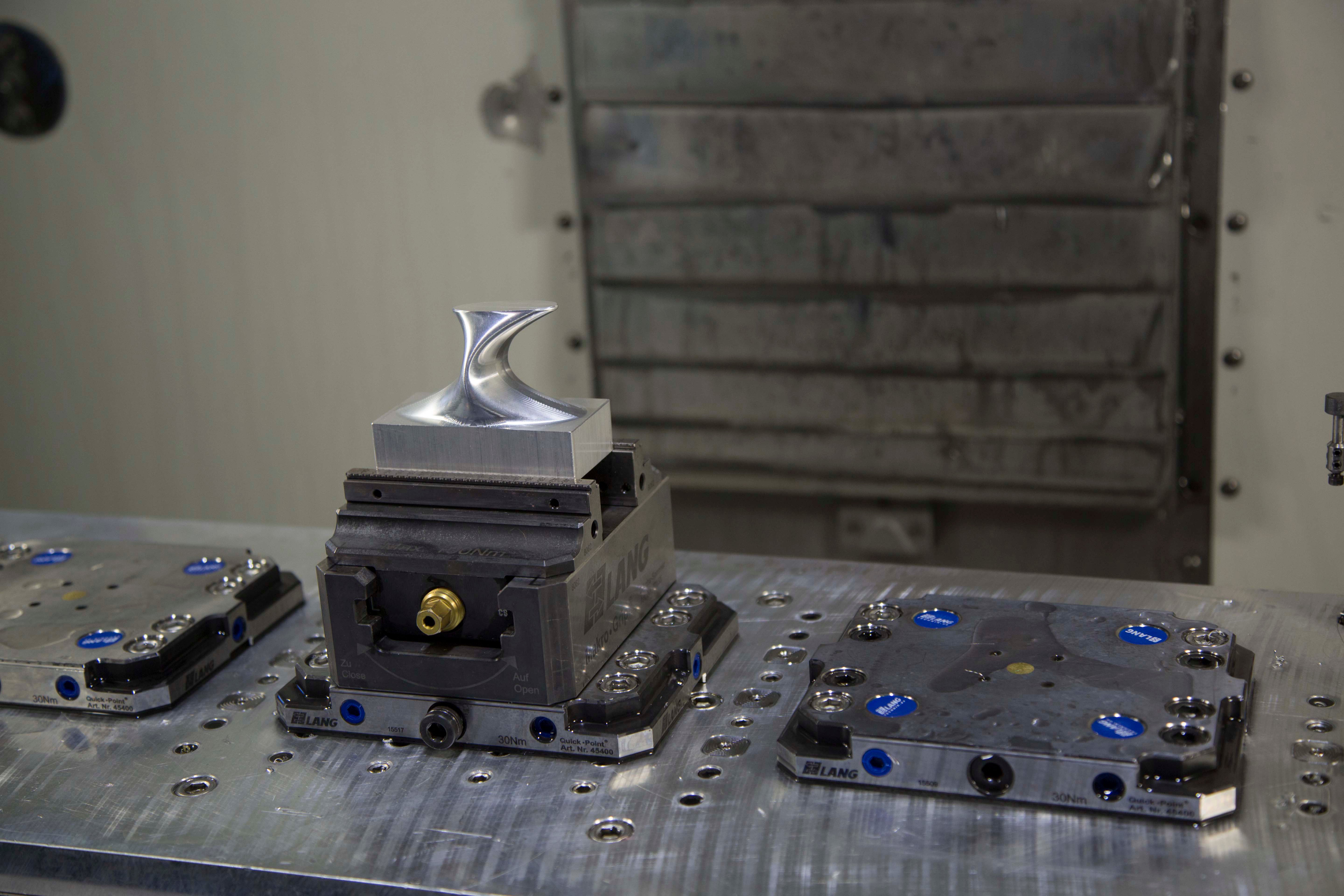 The Lang tombstone system is the simplest, most efficient way to machine a small part from multiple angles on a 3-axis machine. The tombstone is installed inside the Lang receiver plate and holds the Lang vise at a 90 degree angle. The part can be machined from the top and two sides without ever being removed from the vise.