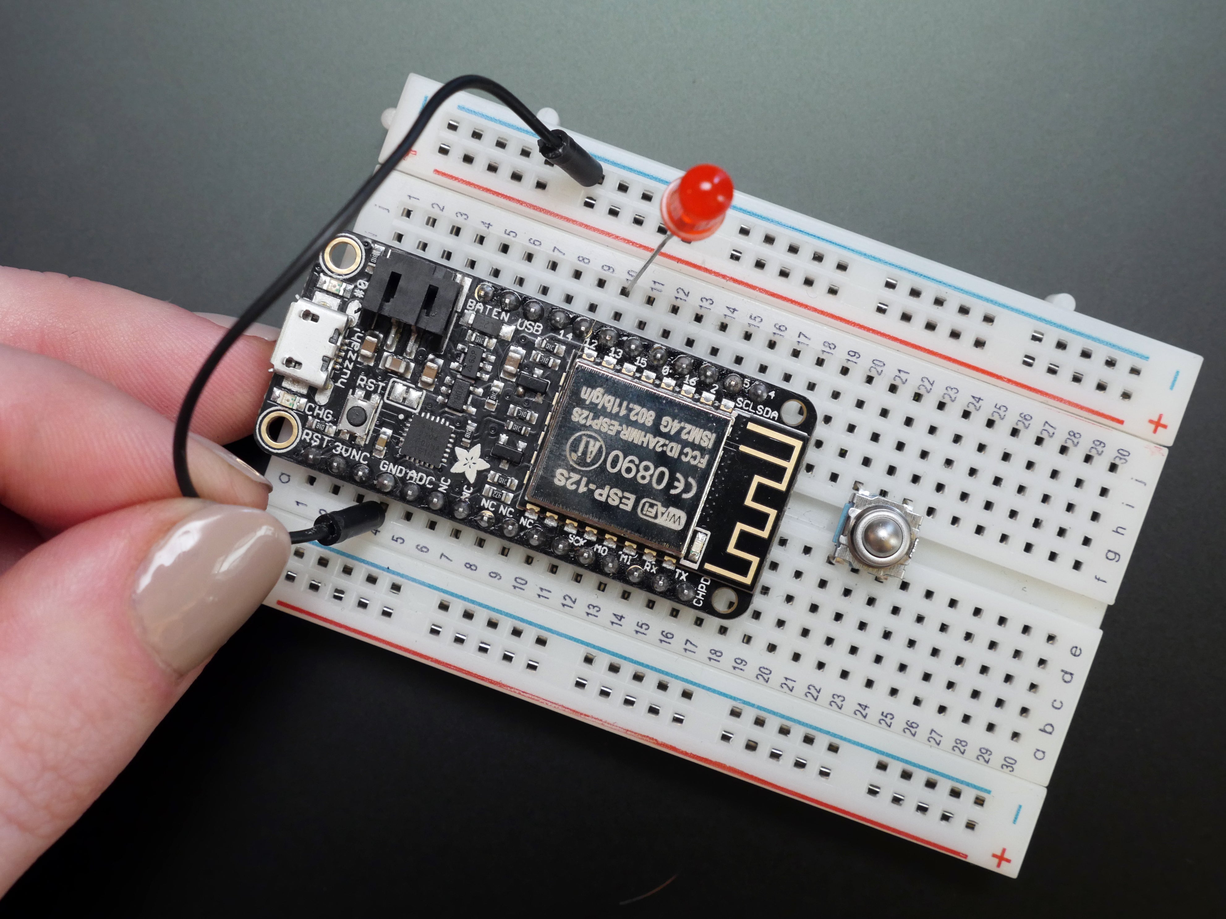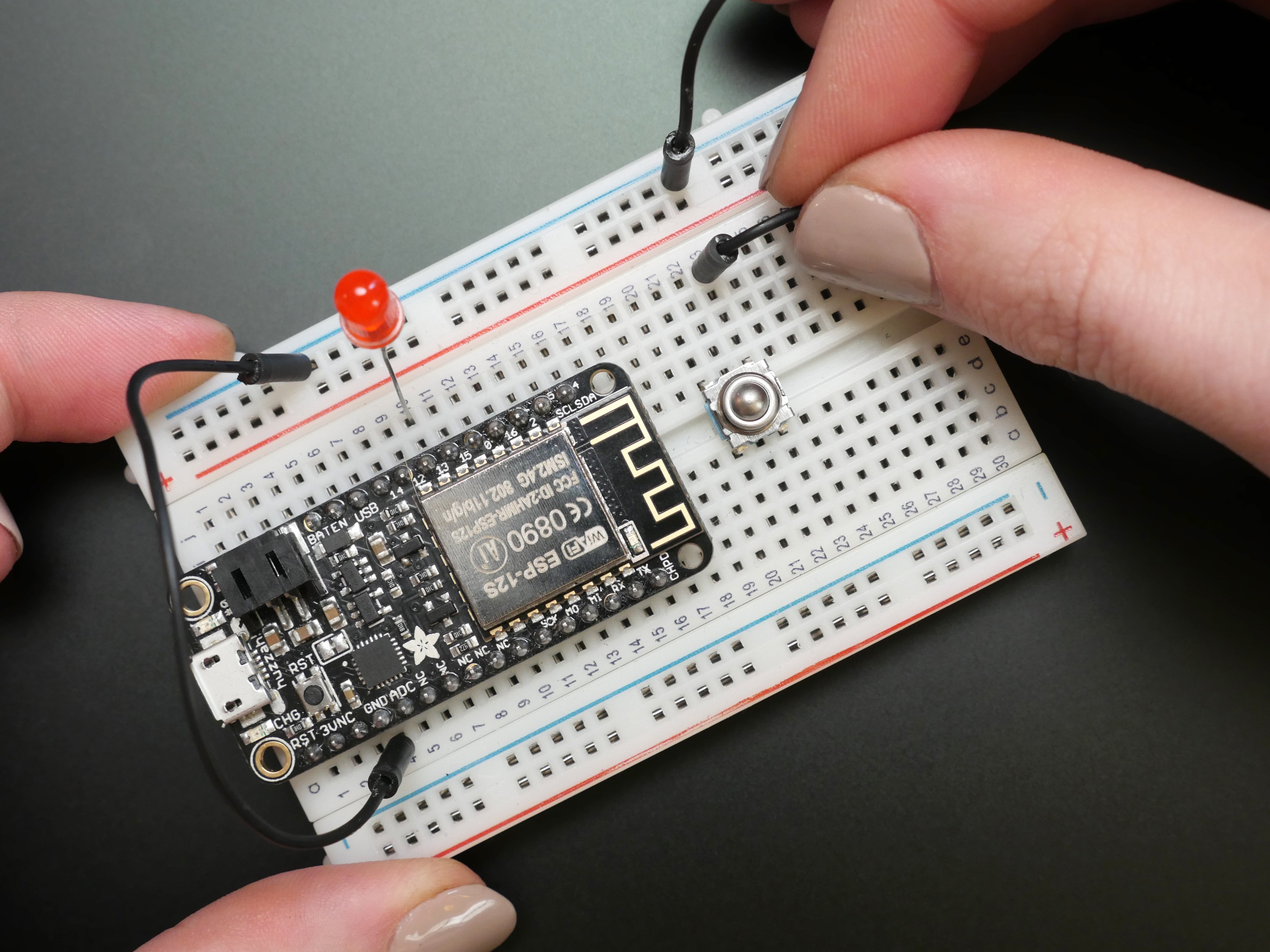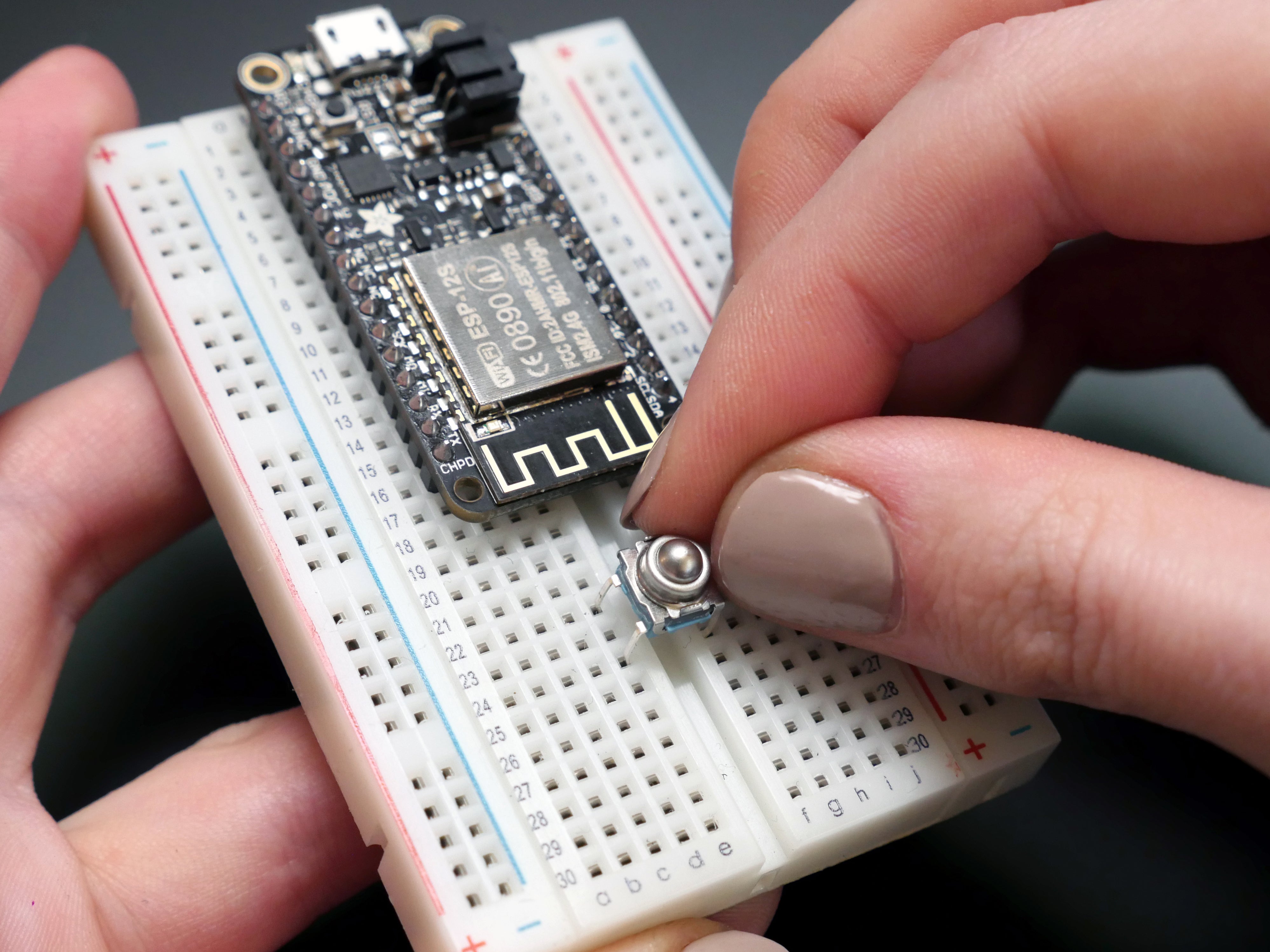 Insert your Feather Huzzah into your solderless breadboard, straddling the middle bar. Do the same with a small pushbutton. Remember to always disconnect power/USB when making wiring changes.