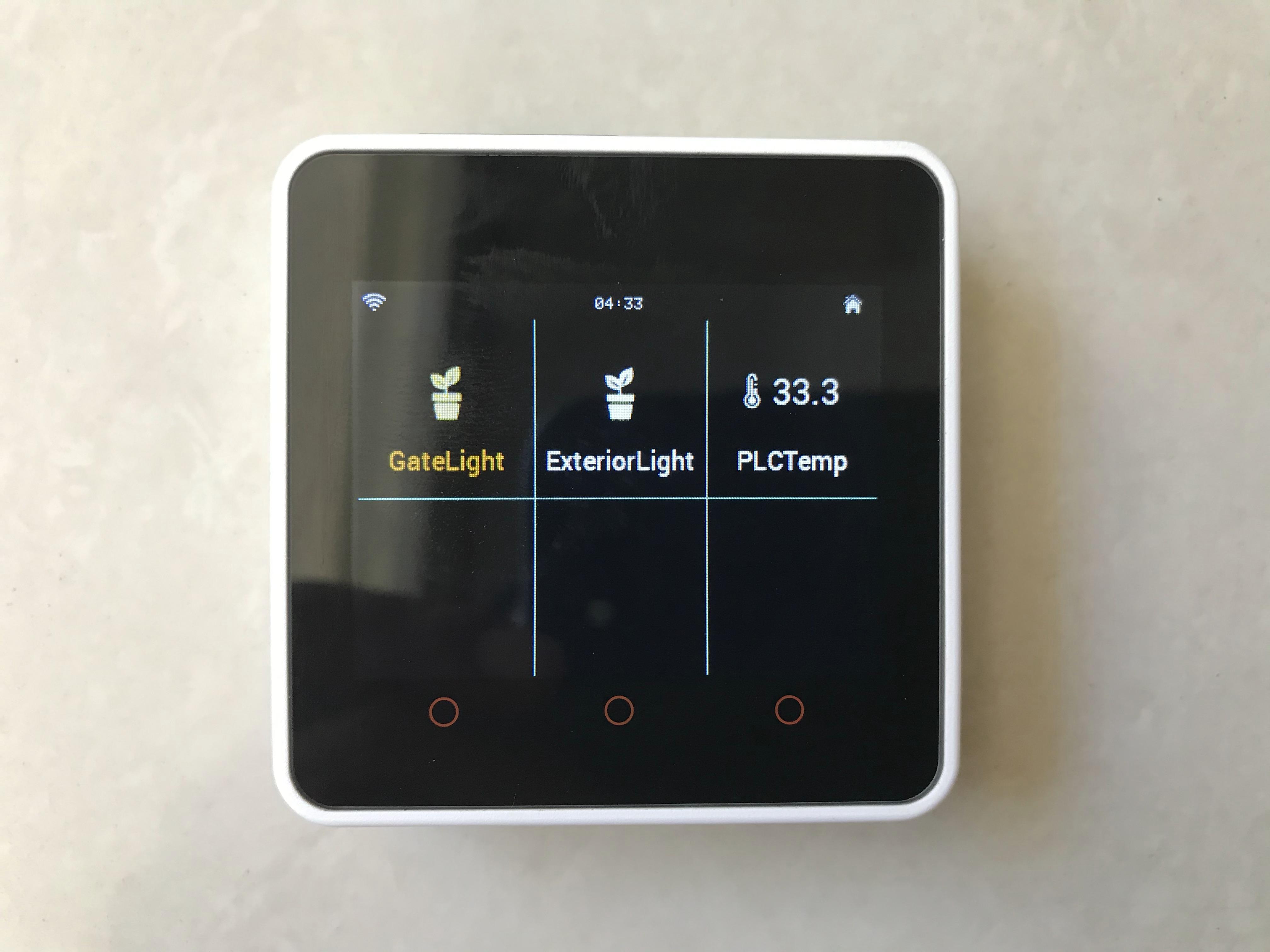 Beside Home Assistant dashboard, one small HMI - M5Stack Core 2 - can control 2 lights (Gate Light & Exterior Light) by its touch screen and show PLC PT100 temperature (PLCTemp):