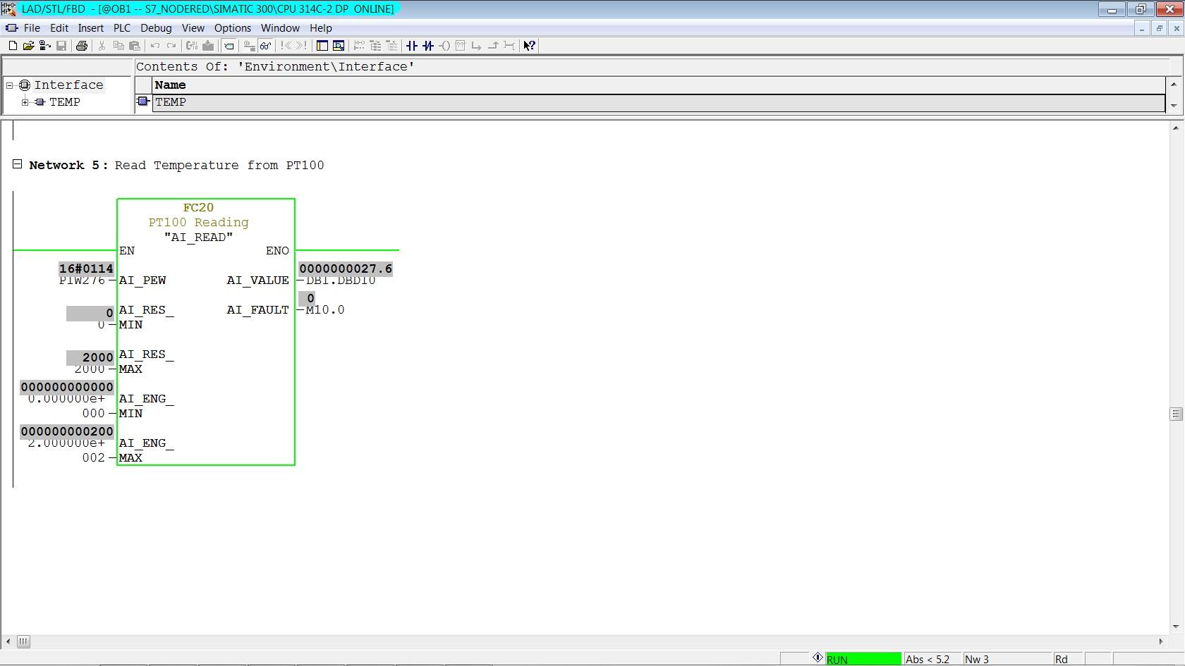 PT100 temperature is read from PIW276 and stored at DB1.DBD10.