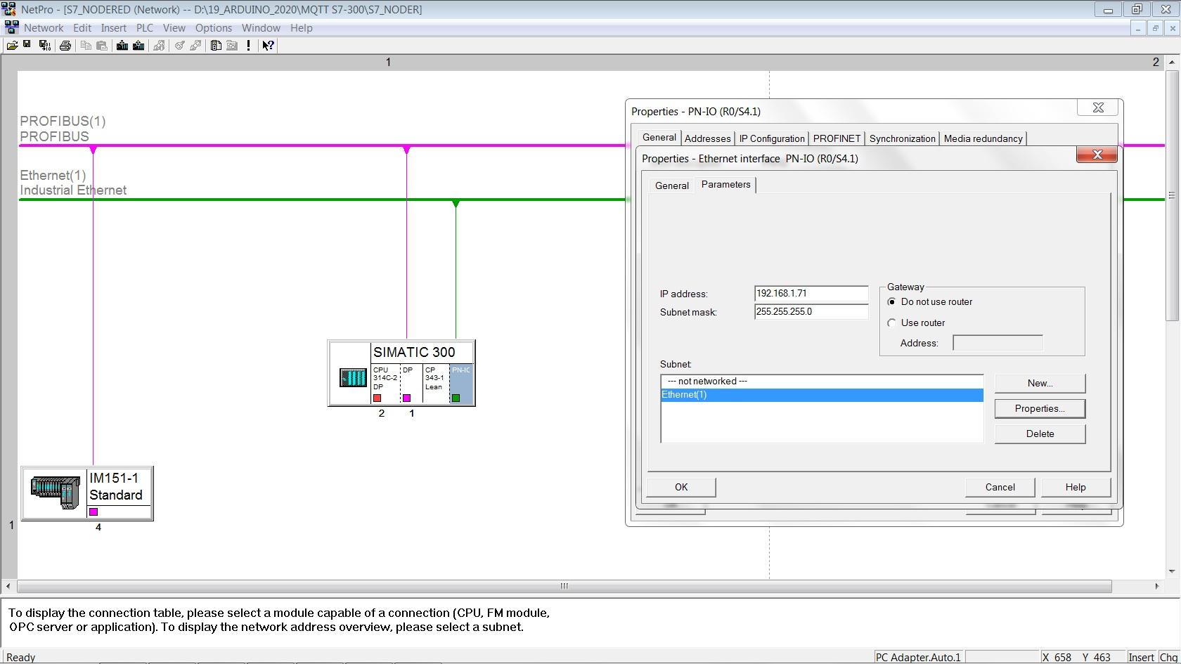 PLC Ethernet communication is configured in NetPro with IP address: 192.168.1.71.