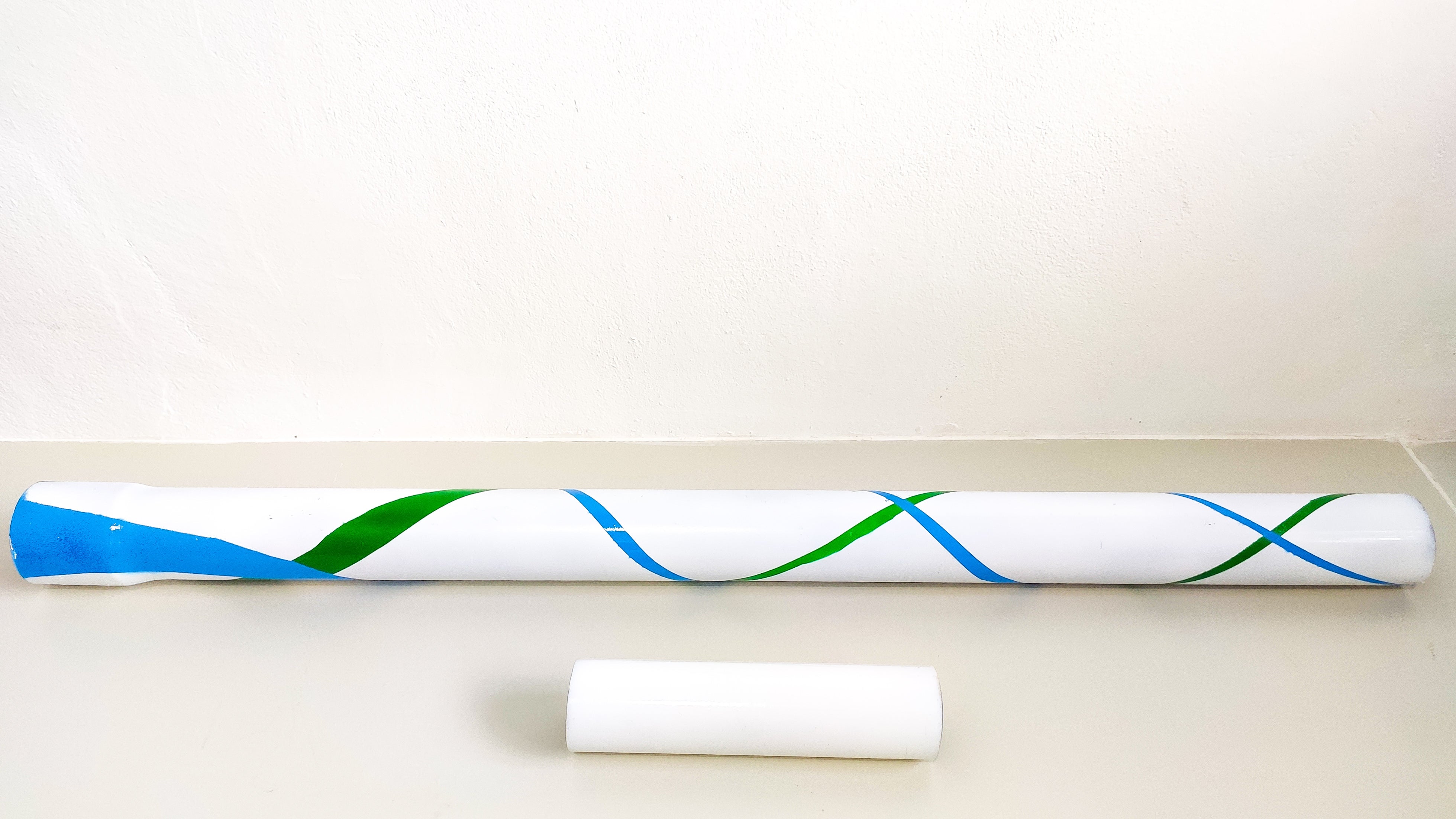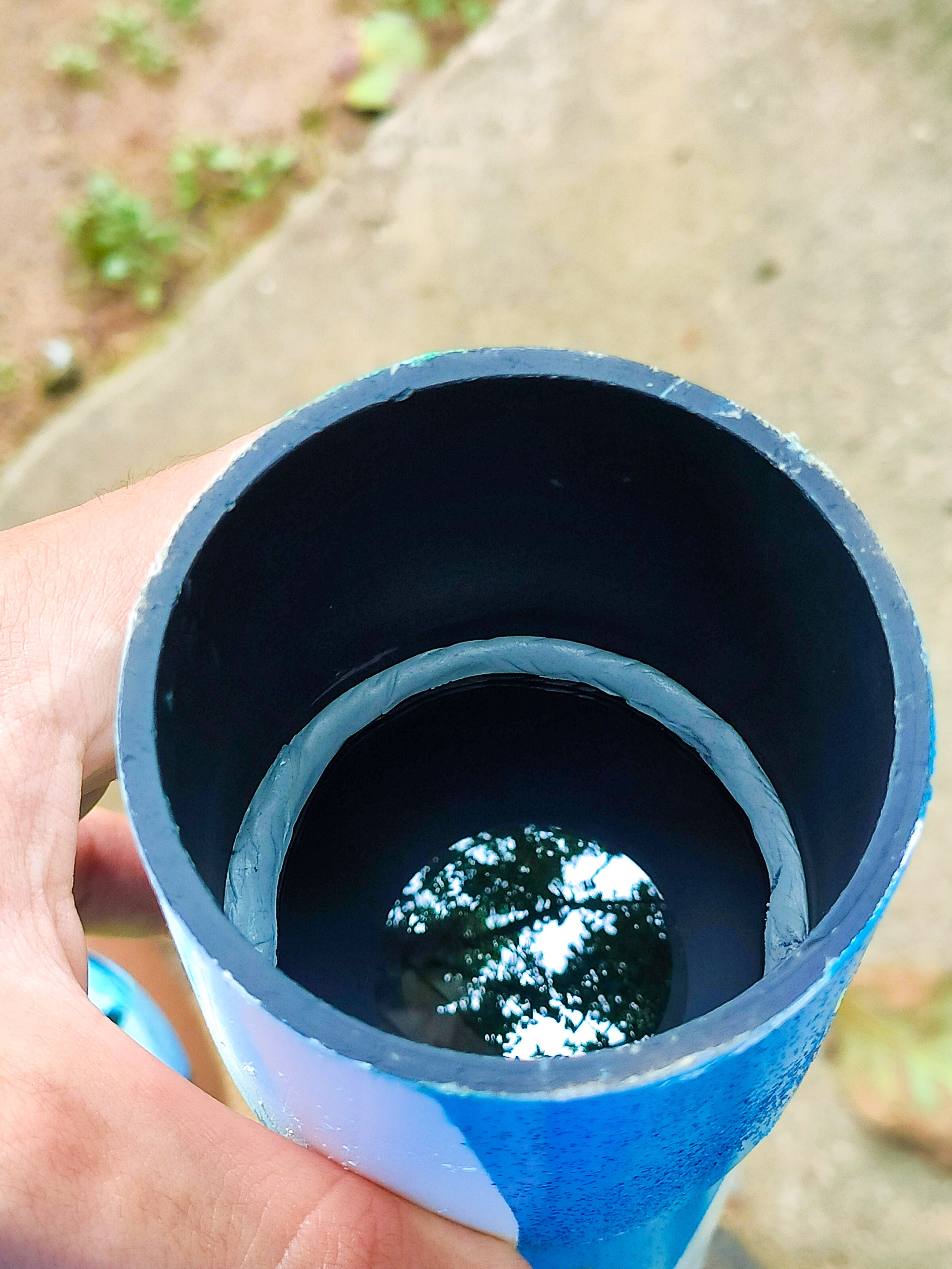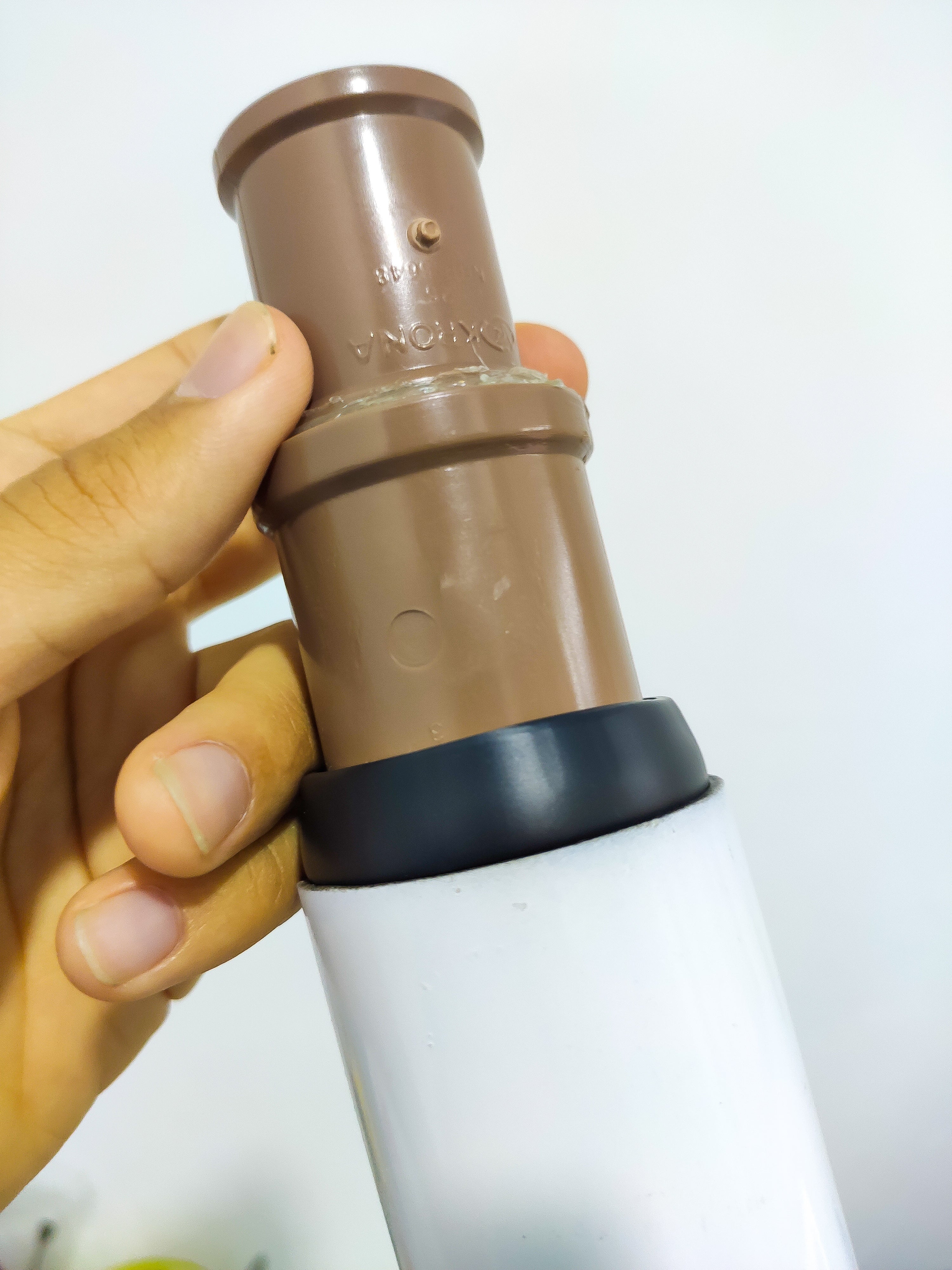 After painting the pipes, you should take the 50 mm pipe and at one end, place a layer of double-sided tape. And then place the 50 mm pipe inside the 60 mm pipe. See the images below.