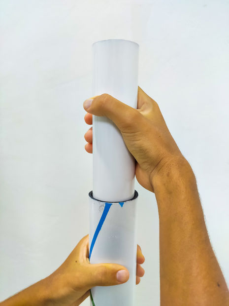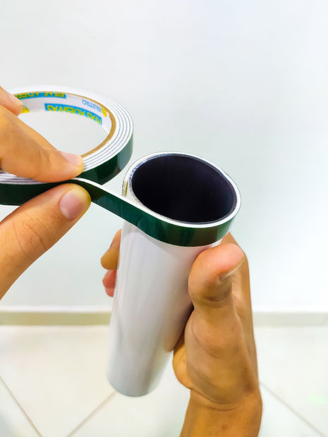 After painting the pipes, you should take the 50 mm pipe and at one end, place a layer of double-sided tape. And then place the 50 mm pipe inside the 60 mm pipe. See the images below.