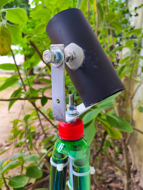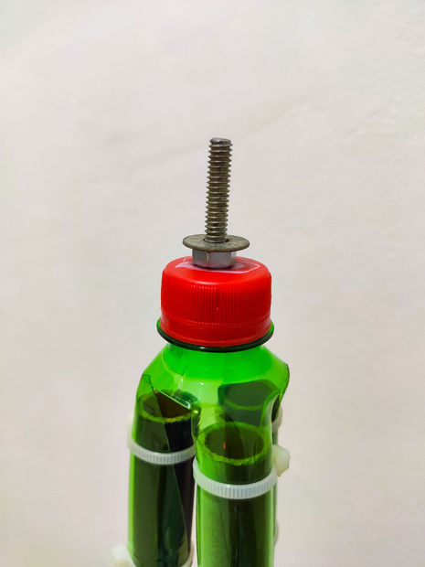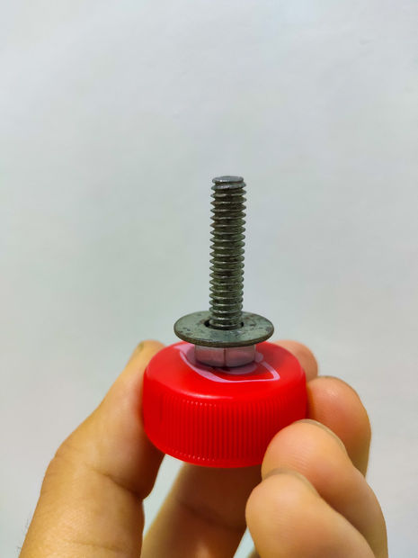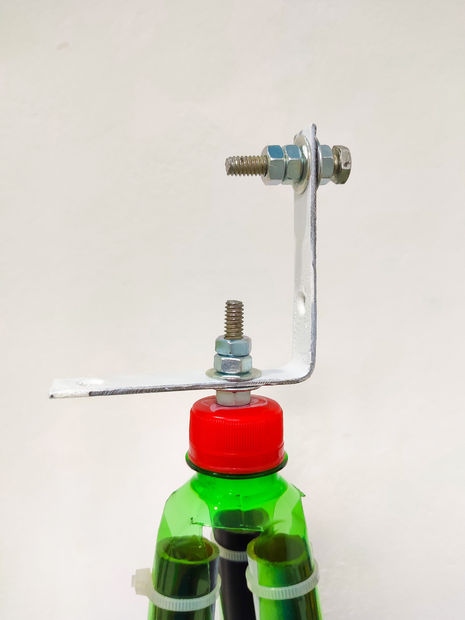 The tripod is almost ready, but we have to do the telescope support, so first make a hole in the center of the PET bottle cap, then place a 1/4 x 1" screw on a 1/4 flat washer from the inside out the bottle cap and secure with a 1/4 flat washer and a 1/4 nut on the outside of the cover. Once it is done, take the angle bracket and place it on the left end of the screw with a 1/4 flat washer and 2 1/4 nuts. At the other end of the bracket, place another 1/4 x 1" screw and secure it with 3 1/4 nuts and 2 1/4 flat washers. See the sequences of images below.