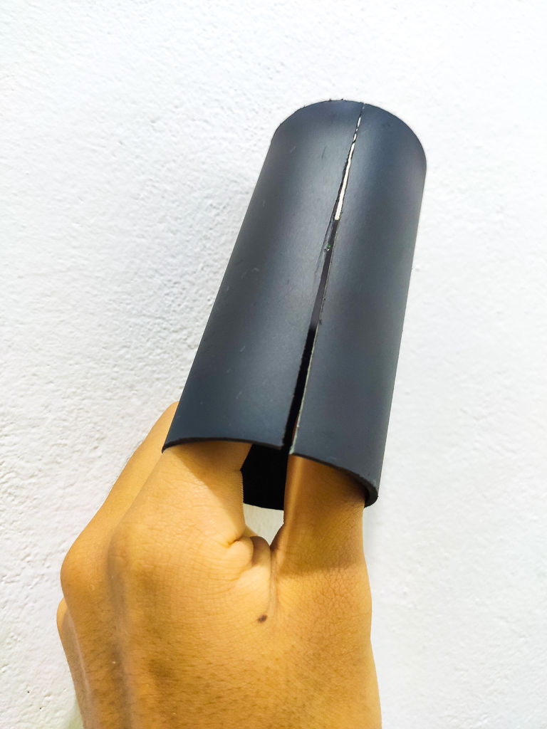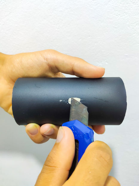 First of all, to make the telescope cradle you will need to take the 20 cm PVC pipe and make a longitudinal cut, then paint it with matte spray paint like the image below.