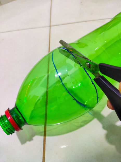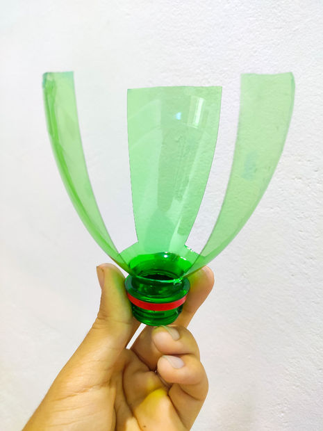 To make the legs of the tripod we have to first mark ten centimeters from the lid of a PET Bottle and then cut that part. After that make three markings with equal distances on this piece of PET bottle that we cut, and cut it again making a kind of petals as shown in the images below.