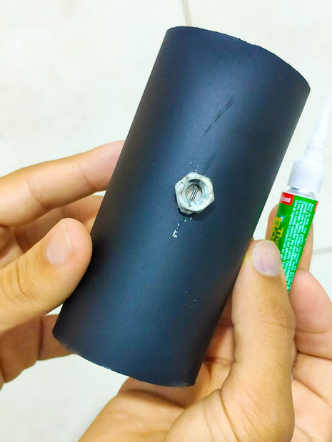 After that, scrape the middle part on the opposite side of the longitudinal cut, and use super bond instant glue and Durepoxi to glue a nut in it.