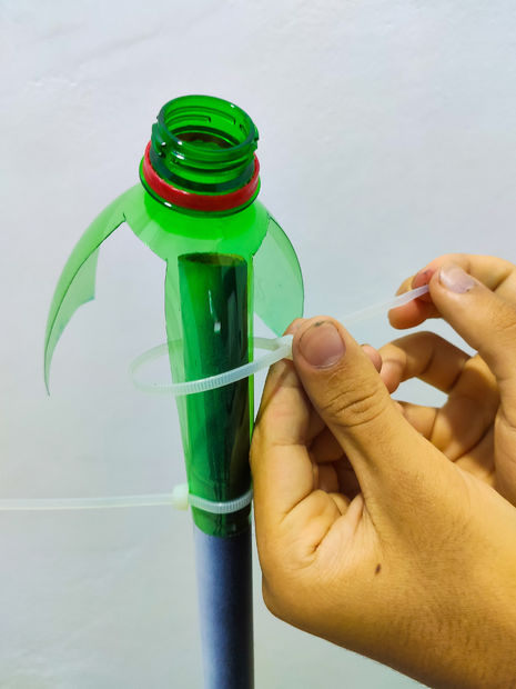 Now, with the nylon clamps, attach each 1/2" weldable PVC pipe to each petal of the bottle. See the image below.
