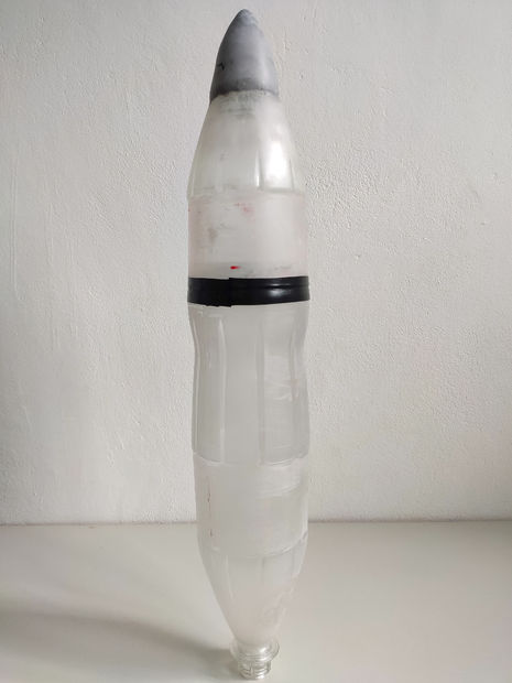 Now we'll have to build the rocket nozzle using the top of the bottle that has been cut, for that you will have to use "Durepoxi" which is an epoxy adhesive and then shape the mass at the tip to form the tip of a rocket with the rest of the bottle, see the image below.