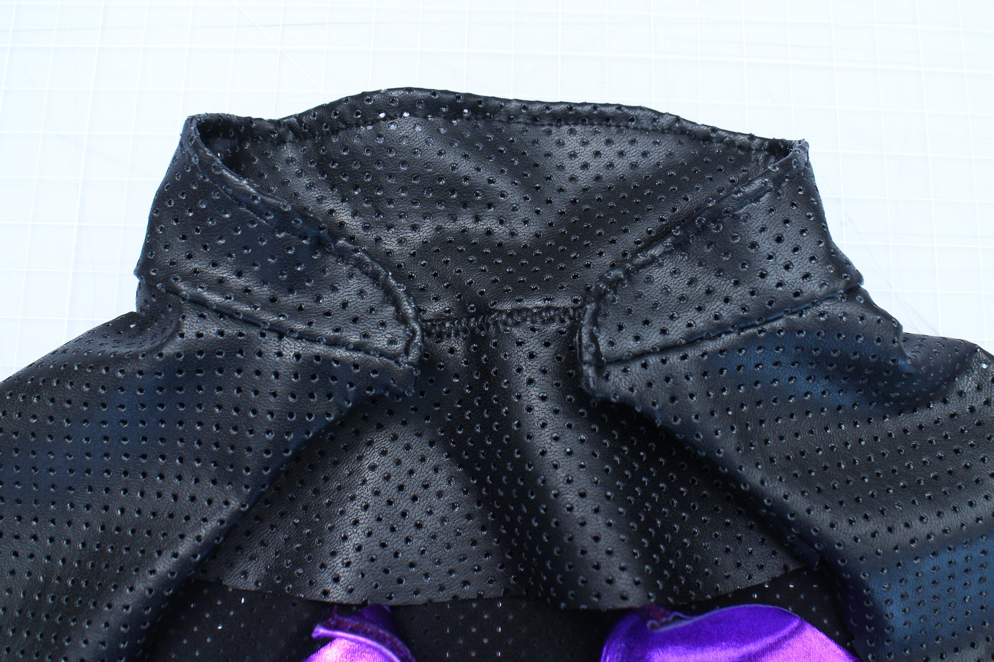 I created a facing for the collar and neck of my supersuit, and once I had set in my sleeves I could sew on my collar and facing. To attach a collar like this first sew the outer layer of the collar onto the neckline of the suit.