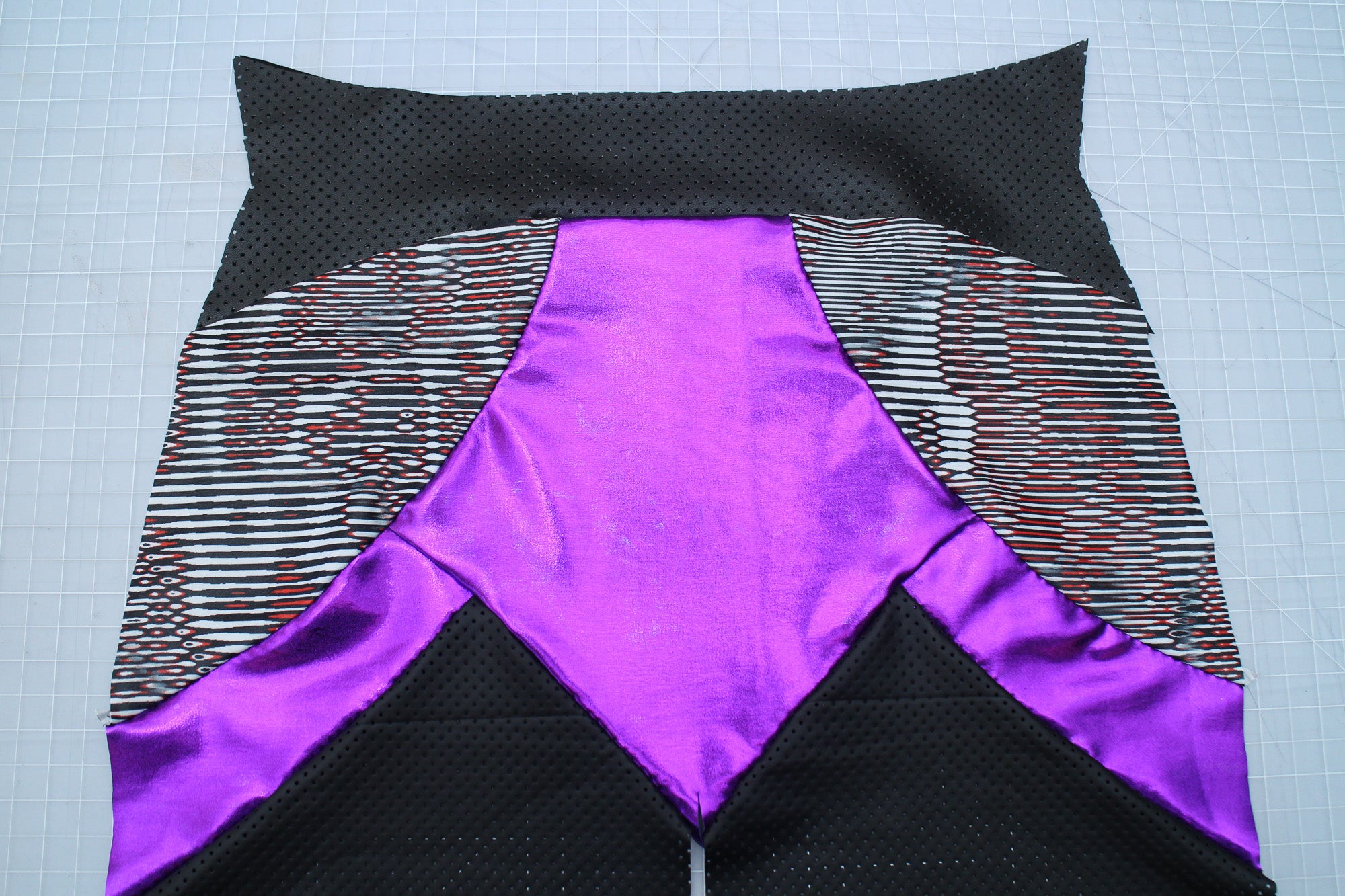 If I was to do this is reverse, attaching the leg to the lower front and then trying to sew in the purple side inset, it would turn the small purple piece into a point that would be very difficult to sew. To avoid any more tricky corner sewing I continued assembling the front of my suit like this:
