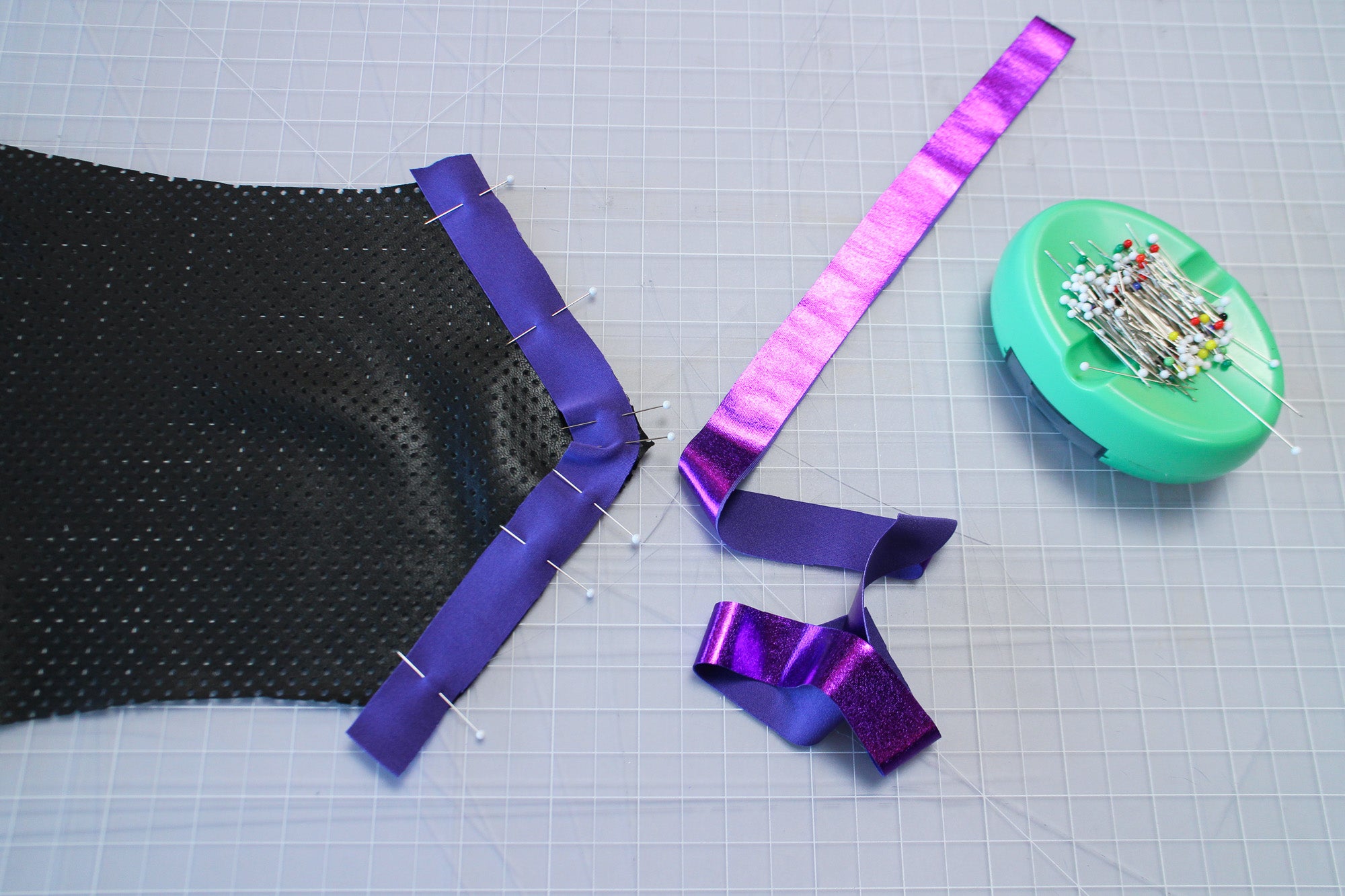 Cut a strip of spandex about 3/4-1" wide, depending on how wide you want your binding, then pin the strip to the edge you want to bind, with the right sides together.