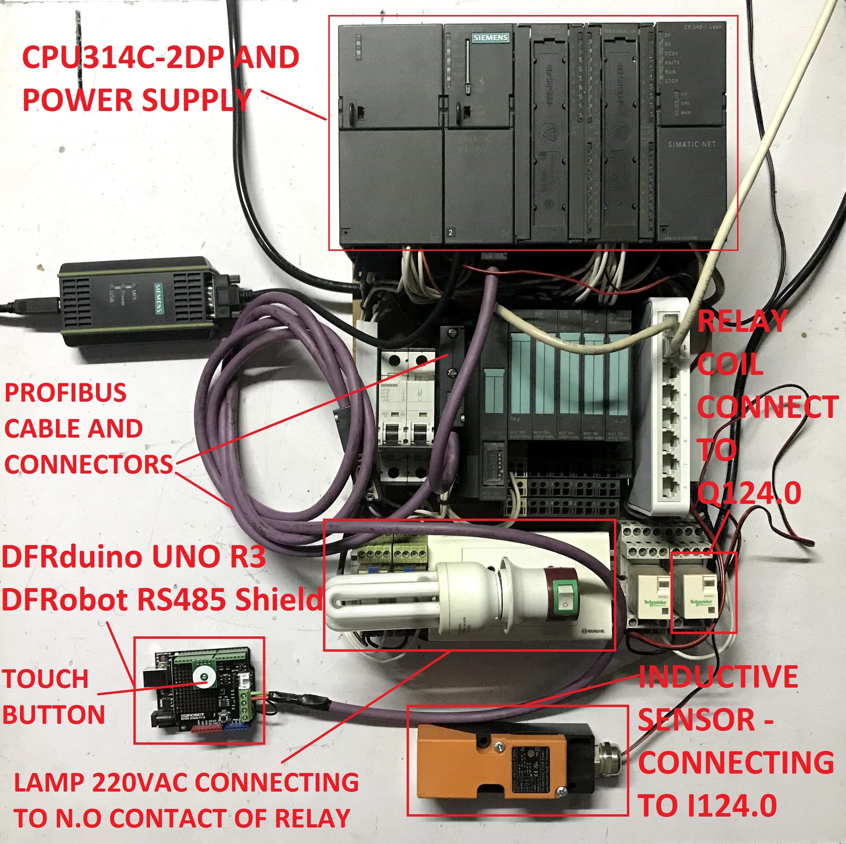 - Touch button is connected to Arduino plus RS485 shield and send the command to PLC S7-300 via Profibus-DP network at Virtual Input I0.0
